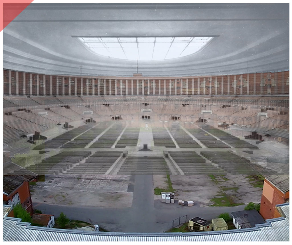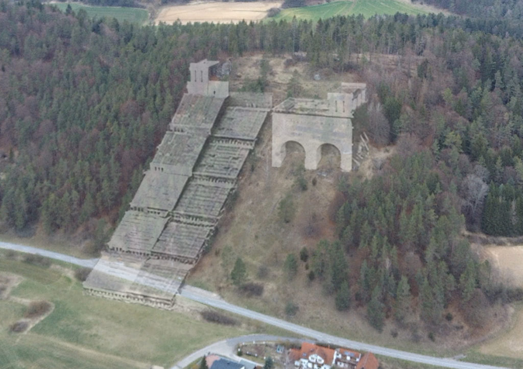 Neue Motive für die Nürnberger ´Kongresshalle´ (West- und Ostseite). Zeigen der fehlenden Baumasse in zwei Versionen (farbig und weiß). Kombination von Drohnen-Fotos mit alten Ansichten.