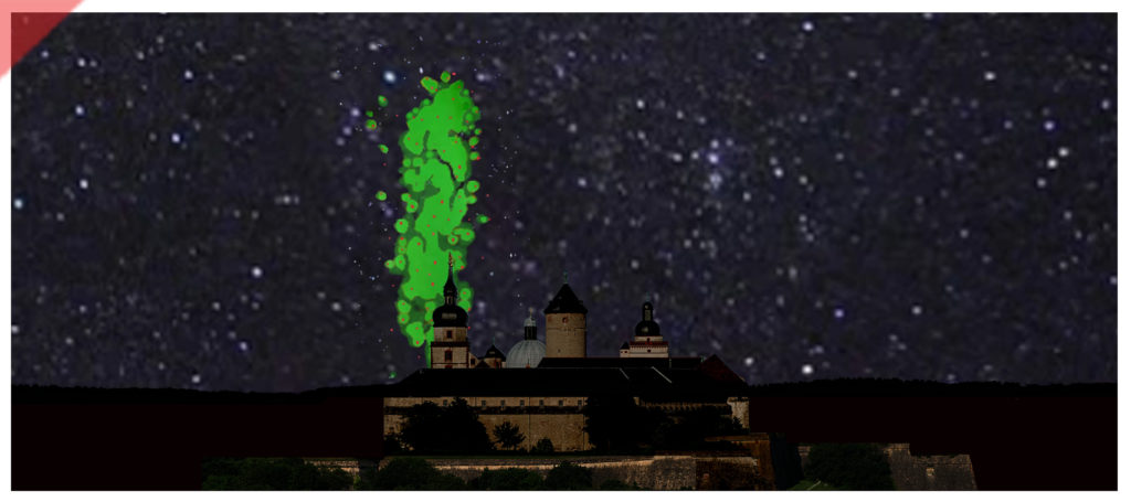 Detail-Blick auf die 1. Phase: Das Unheil nimmt seinen Lauf; Abwerfen von grünen „Target-Indicators“ (Zielmarkierungen) über der verdunkelten Altstadt. Leuchtbomben kamen zu Beginn noch nicht zum Einsatz. Mit dem „H2S“-Radar und dem „Oboe“-Funkleitstrahl konnte das Stadtgebiet auch im Dunkeln gefunden werden. Dies belegen britische und deutsche Quellen. In der Bildmitte ist die ´Festung Marienberg´ zu sehen.