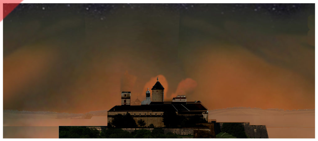 Detail-Blick auf die 3. Phase: Die Stadt brennt orangerot. Auch Teile der ´Festung Marienberg´. Die abgeworfenen Stabbrandbomben erzeugten einen Flächenbrand mit über 2.000 Grad Celsius. Bis zu 5.000 Menschen kamen ums Leben – verbrannt, erstickt oder verschüttet. Denn in Würzburg gab es für die Bevölkerung keine massiven oder öffentlichen Luftschutzbunker.