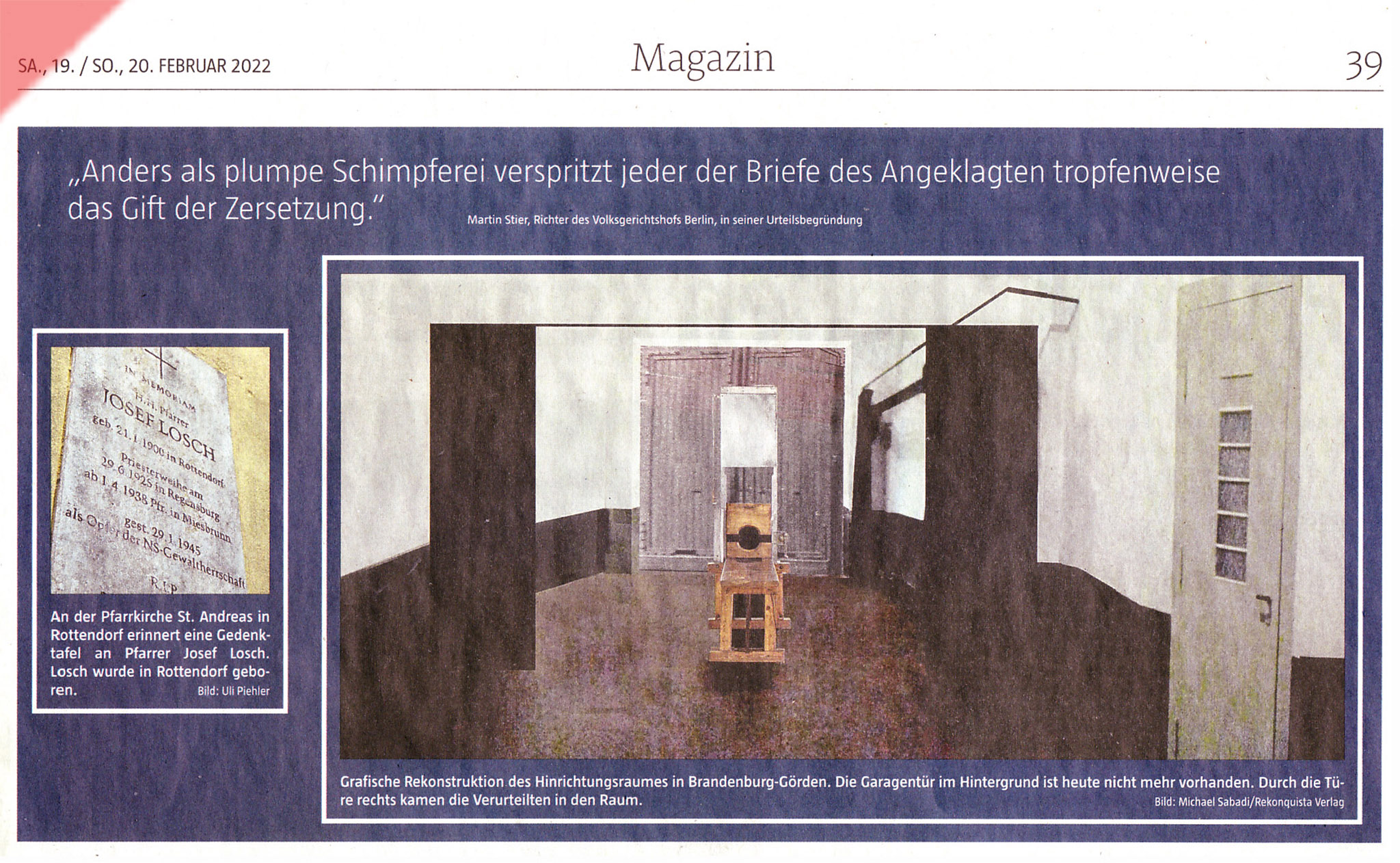 Presseartikel mit Verwendung eines Bildes unser Galerie. Am 20. Februar 2022 berichtete die Zeitung „Der neue Tag“ über die Hinrichtung von Pfarrer Losch im Gefängnis Brandenburg-Havel (vormals: Görden). Der von uns rekonstruierte originale Hinrichtungsraum ist darin abgebildet. Link: https://www.rekonquista.de/der-gedenkraum-im-gefaengnis-brandenburg-havel-das-richtige-fallbeil-erstmals-in-farbe/