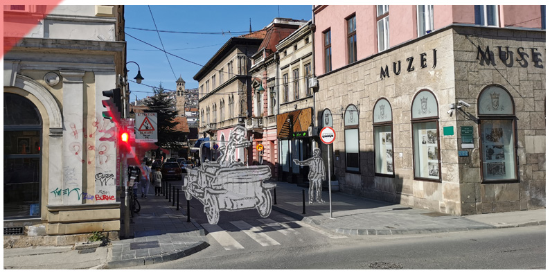 Das Attentat von Sarajevo. 28. Juni 1914. Einblenden des Fahrzeugs und der Beteiligten im aktuellen Stadtbild.