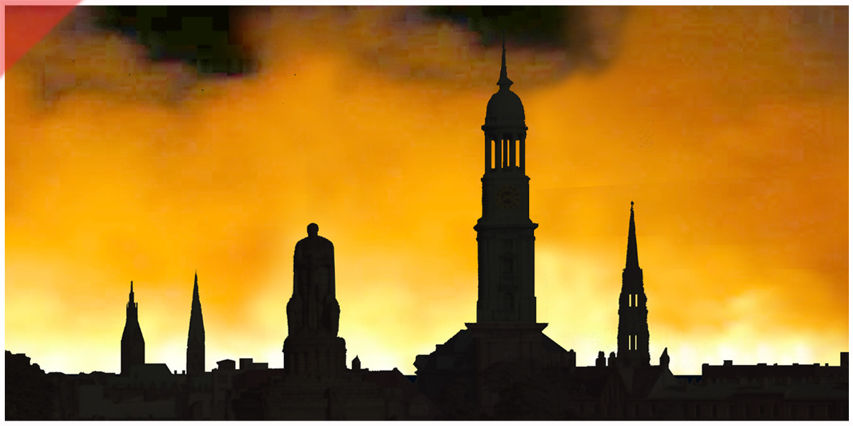 80. Jahrestag der ´Operation Gomorrha´. Der ´Feuersturm´ vom 27./28. Juli 1943 in Hamburg. Visualisieren des Flächenbrandes mit der speziellen Optik des Feuers. Panorama-Ansichten mit den Türmen der Stadt, dem Bismarck-Denkmal und der Nikolaikirche. Luftangriffe durch die britische Royal Air Force.