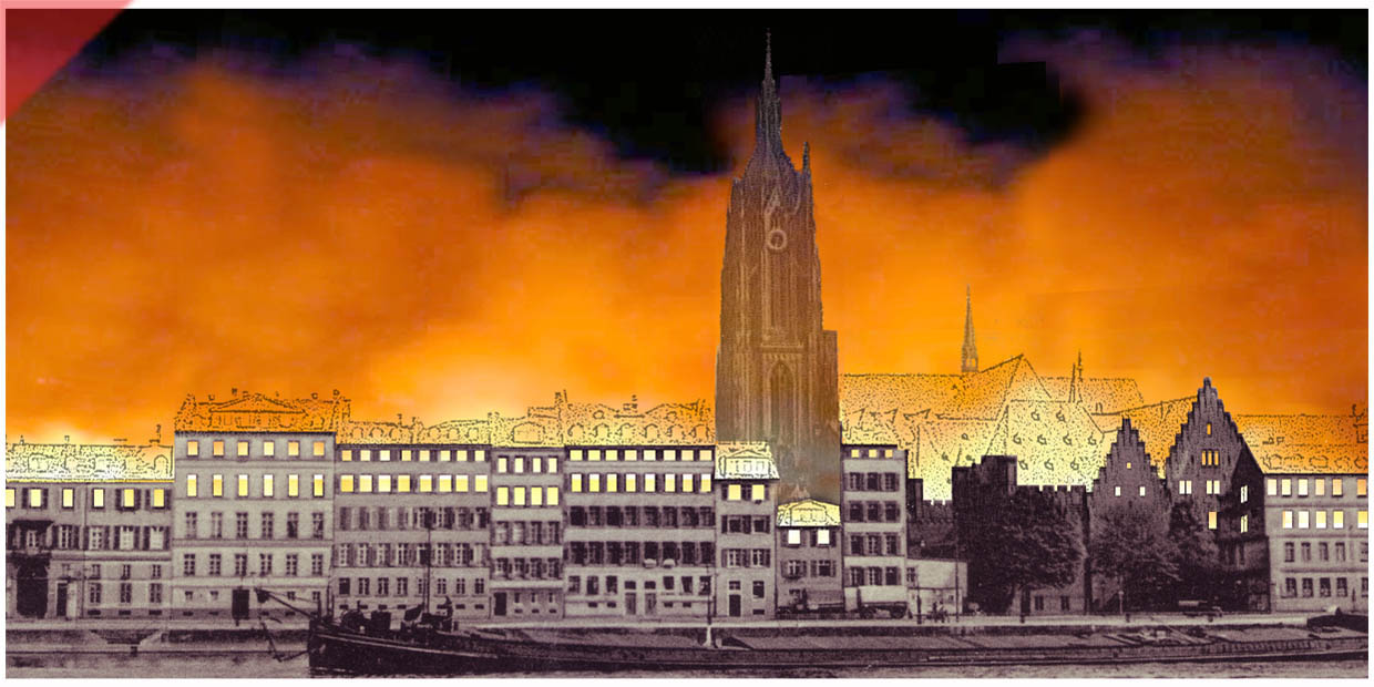 Die Zerstörung der Altstadt von Frankfurt/Main durch zwei Luftangriffe am 18. und 22. März 1944. Visualisieren der Flächenbrände und der damaligen Optik des Feuers. Verwenden von alten Ansichtskarten mit dem Turm des ´Doms´.