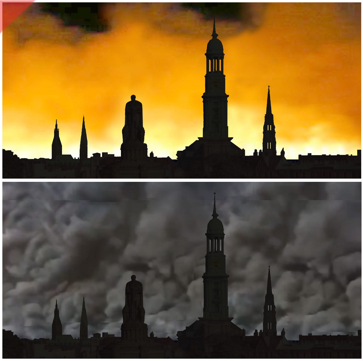 Feuersturm-Rauch-vergleich-Bismarck-Hamburg-Operation-Gomorrha-hell-27.-28.-Juli-1943-Nikolaikirche-Rathaus-Silhouette-Panorama
