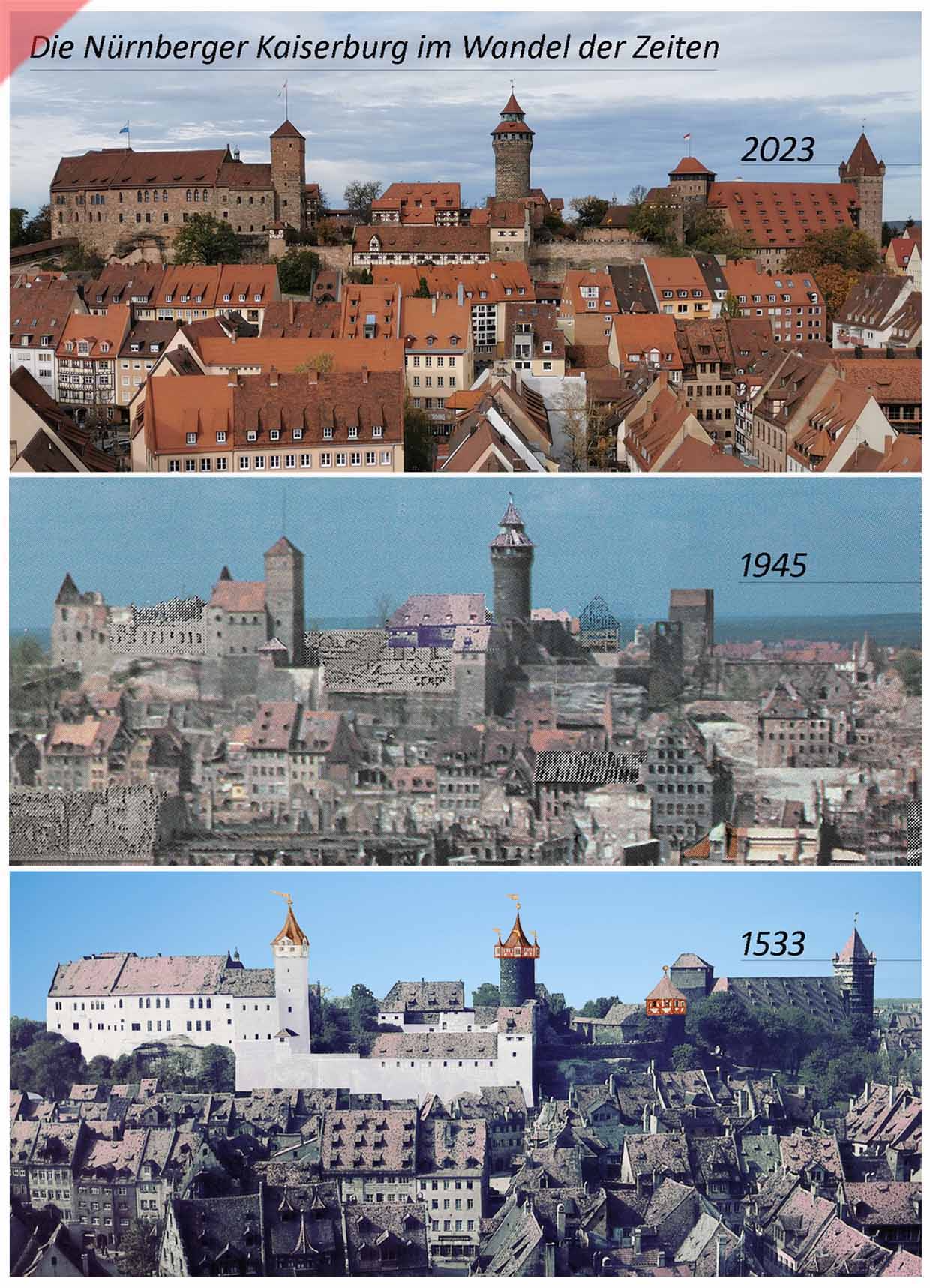 Panorama der Nürnberger ´Kaiserburg´. Drei Ansichten im Vergleich. 1533 – 1945 – 2023.