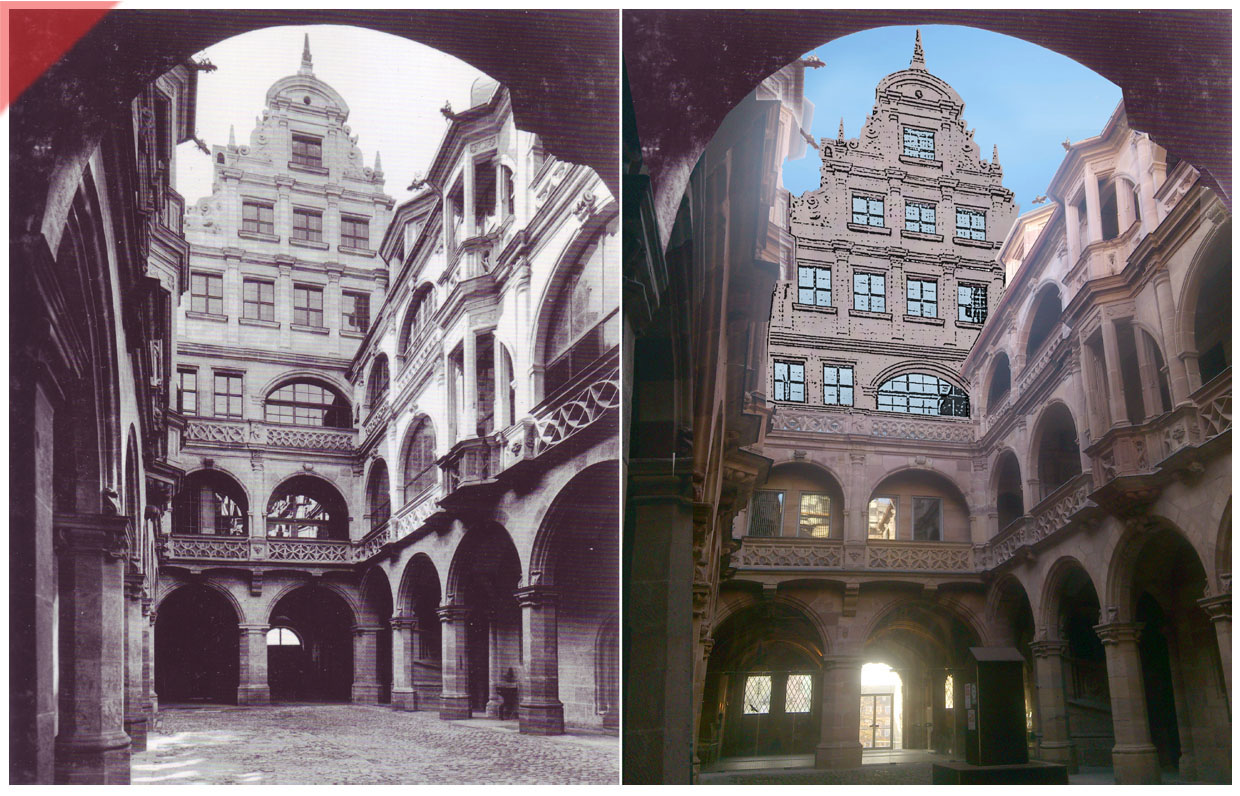 Rekonstruieren und Kolorieren des 1945 zerstörten ´Südgiebels´ im Hof des Nürnberger ´Pellerhauses´. Einfügen in die aktuelle Bau-Situation des Jahres 2023. Leider wird dies wohl nie mehr Realität werden. Deshalb unsere Visualisierungen.