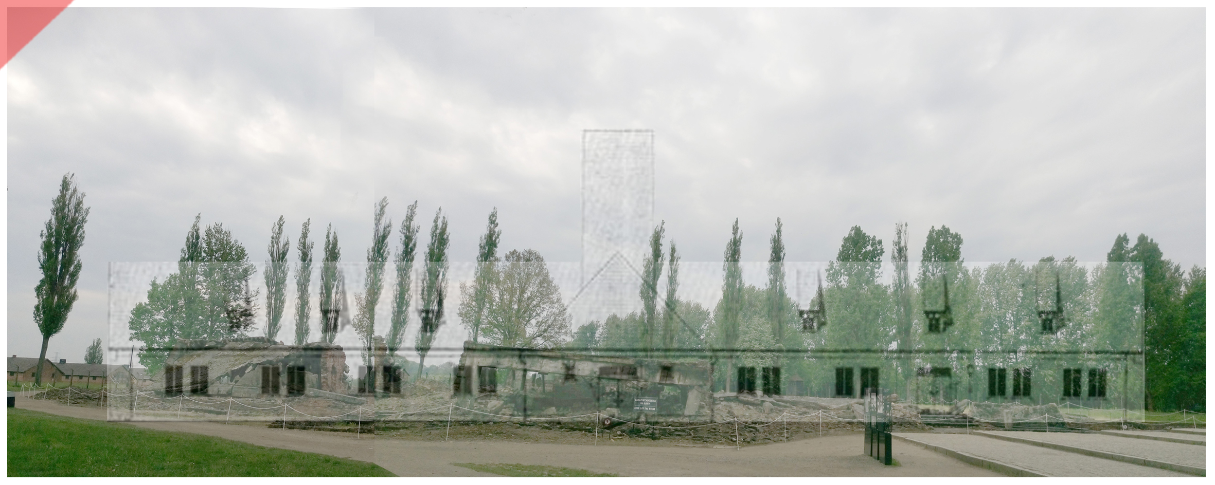 Nach über 20 Jahren erfolgte Anfang Mai 2018 wieder ein Besuch der Gedenkstätte Auschwitz-Birkenau. Mit dem entstandenen Fotomaterial in Kombination mit historischen Abbildungen können wir nun über die jetzigen Ruinen bzw. gesprengten Gebäude die ursprünglichen Gebäude-Silhouetten setzen. Die Raummaße und -dimensionen werden so im Gelände wieder sichtbar.