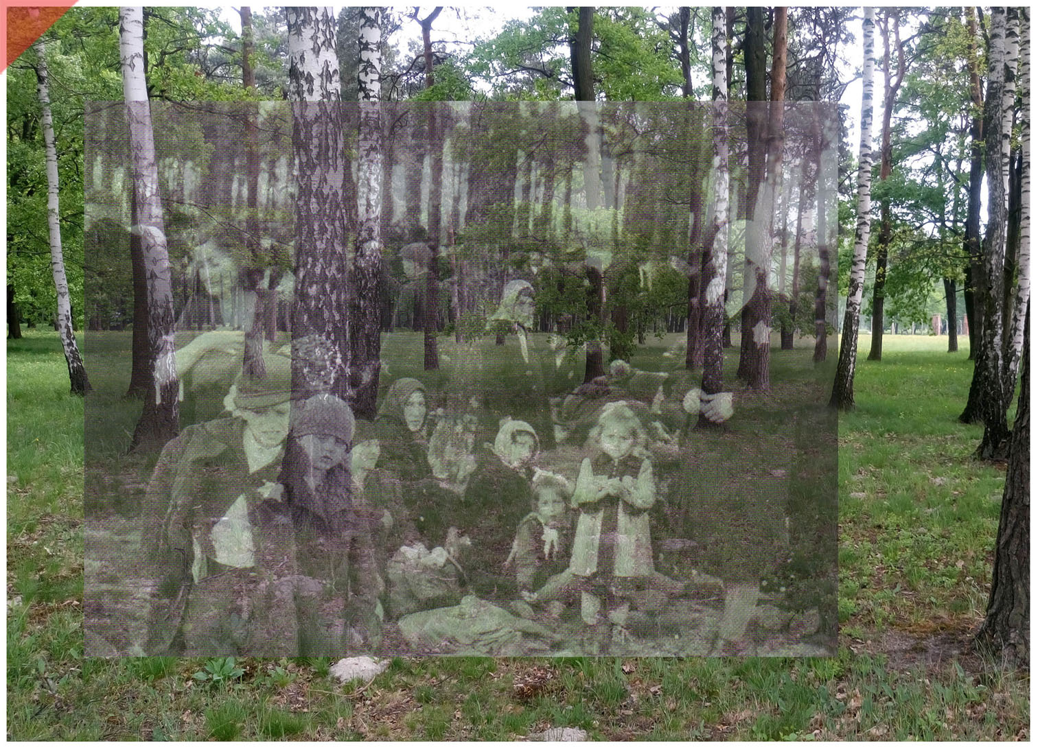 Das Waldstück in der Nähe des Krematoriums IV: Dort mussten die Menschen warten. Wir möchten dem Mädchen vorne rechts ein Denkmal setzen. Es zeigt mit seinen ineinander gelegten Händen und dem Gesichsausdruck seine ganze Unschuld. Das Foto stammt aus dem Mai oder Juni 1944. Der genaue Fotopunkt lässt sich nicht mehr ermitteln. Der schmale Weg diagnol durch das Schwarz-Bild dient als Orientierung zum Einbau der aktuellen Aufnahme.