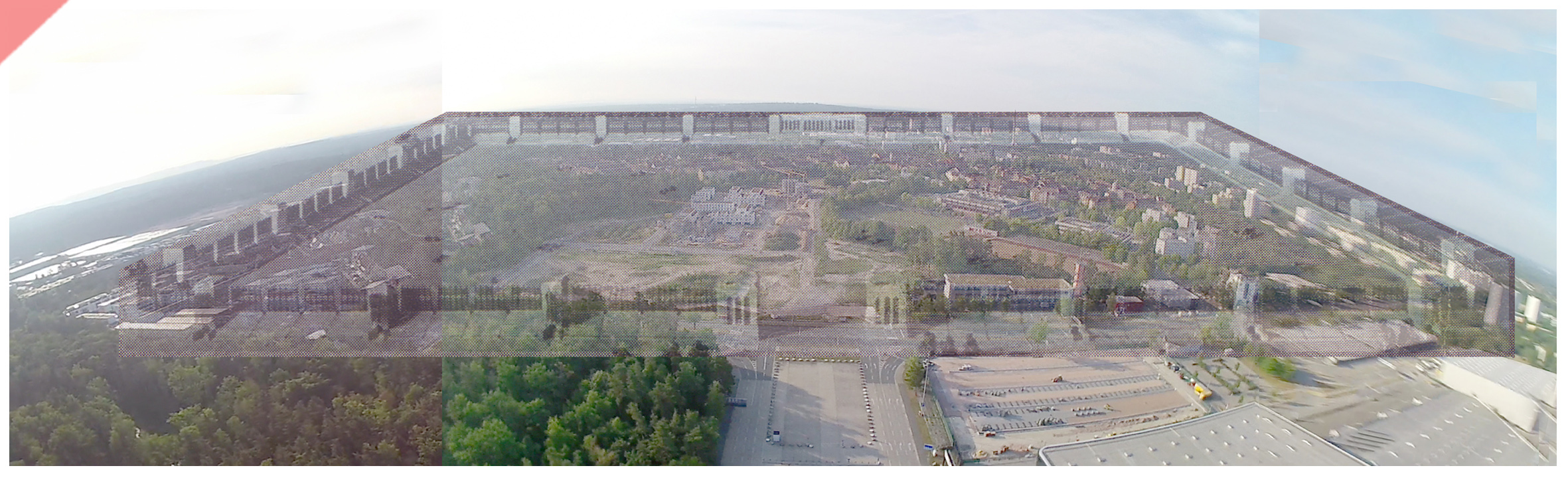 Die gleiche Blickachse: Nun aus 75 Meter Höhe. Die geplante Größes des „Märzfeldes“ wird deutlich. Unsere Drohnen-Aufnahme ist noch nicht ganz ideal (etwas zu hoch; der Blickwinkel auf das „Märzfeld“ müsste flacher sein) – siehe Haupttribüne im Hintergrund. Der Drohnenflug wird von uns wiederholt. Mittels Vergleichslinien bauten wir auch hier das Schwarz-Weiß-Foto (ein Blick auf das komplette Baumodell so passgenau wie möglich ein.