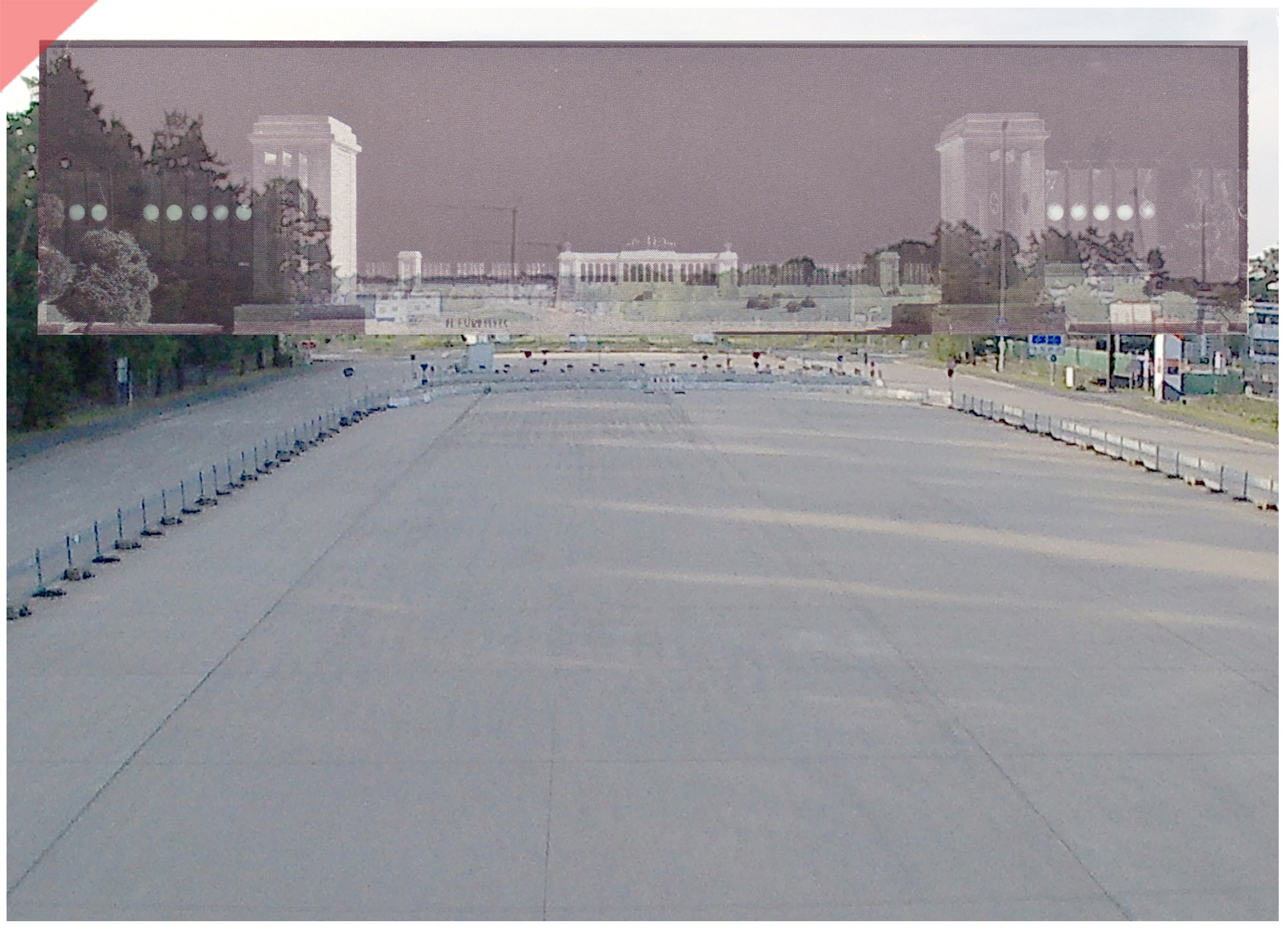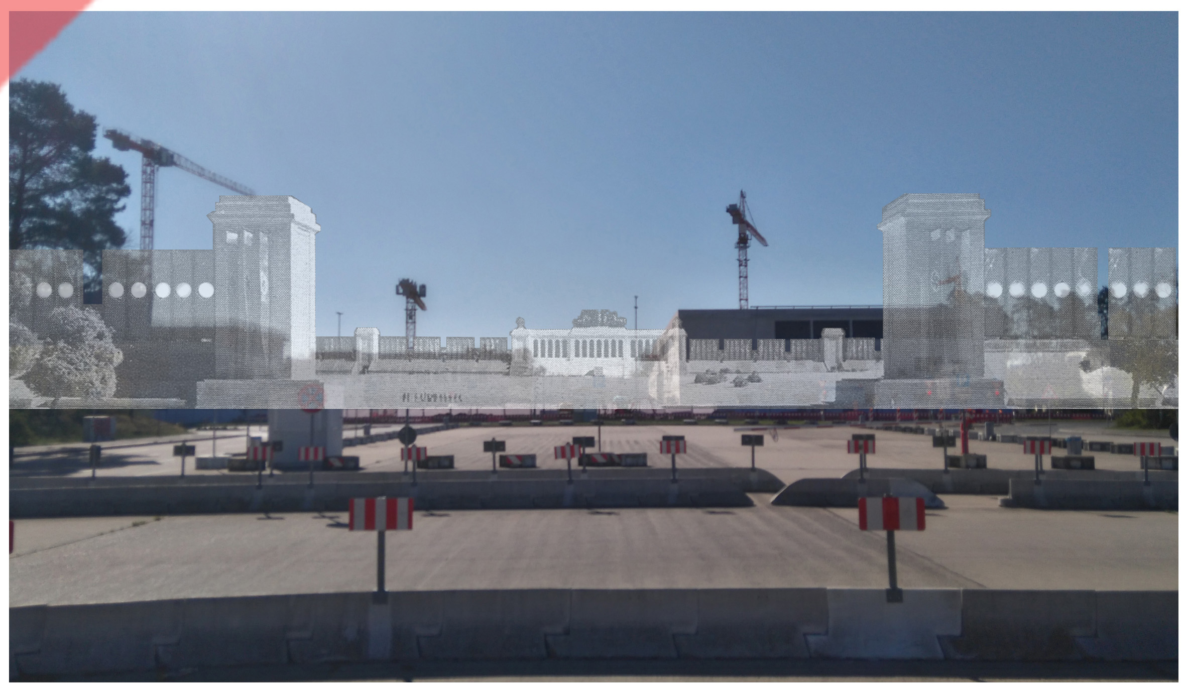 Blick von der „Großen Straße“ in Richtung nach Süden – direkt auf den Eingangsbereich des geplanten „Märzfeldes“ hin (im Hintergrund die Haupttribüne). Mittels Vergleichslinien bauten wir das Schwarz-Weiß-Foto (ein Ausschnitt des verkleinerten Baumodells) so passgenau wie möglich ein. Im Vordergrund der zubetonierte Bereich der früheren „Großen Straße“.