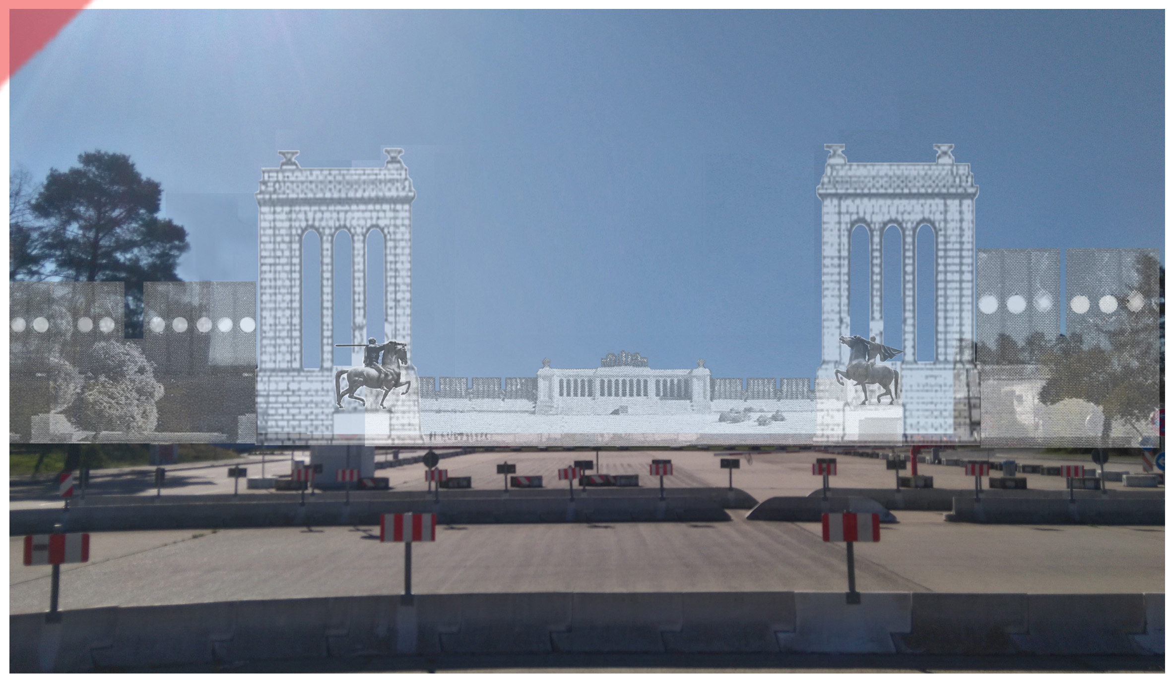 Ein weiterer Blick auf den Eingangsbereich zum „Märzfeld“. Zu sehen ist die zweite Entwurfs-Variante mit massigen Eingangstürmen und zwei geplanten Reiterfiguren von Josef Thorak („Schwertträger“ und „Bannerträger“).