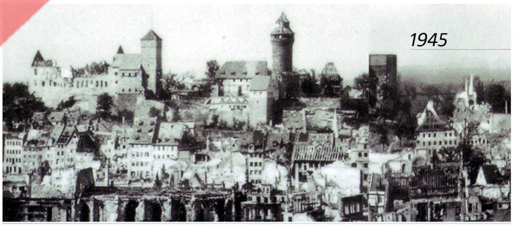 Als Tiefpunkt kann man die Zerstörung der Nürnberger Altstadt am Abend des 2. Januars 1945 bezeichnen. Große Teile der Burg brannten damals aus oder ab. Es ist die große Leistung der Wiederaufbau-Zeit nach 1945, das Panorama der Nürnberger Burg wieder hergestellt zu haben. Bildquelle: StadtAN A 41/I Nr. Repro-114-7.