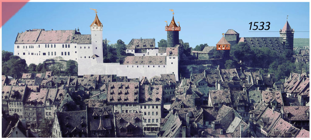 Kaiserburg-Burg-Nuernberg-Baugeschichte-optik-aussehen-1533-Haller-Buch-andere-Optik-Tuerme-Walpurgiskapelle-Panorama-2022-1945-1533-Damals-Jetzt-Vergleich-gekalkte-Mauern-Sinvellturm-Heidenturm