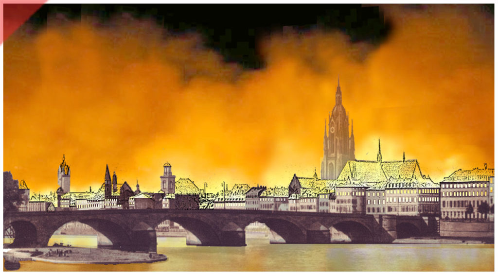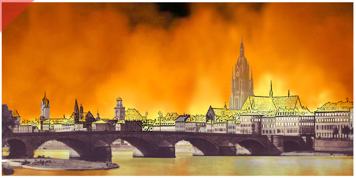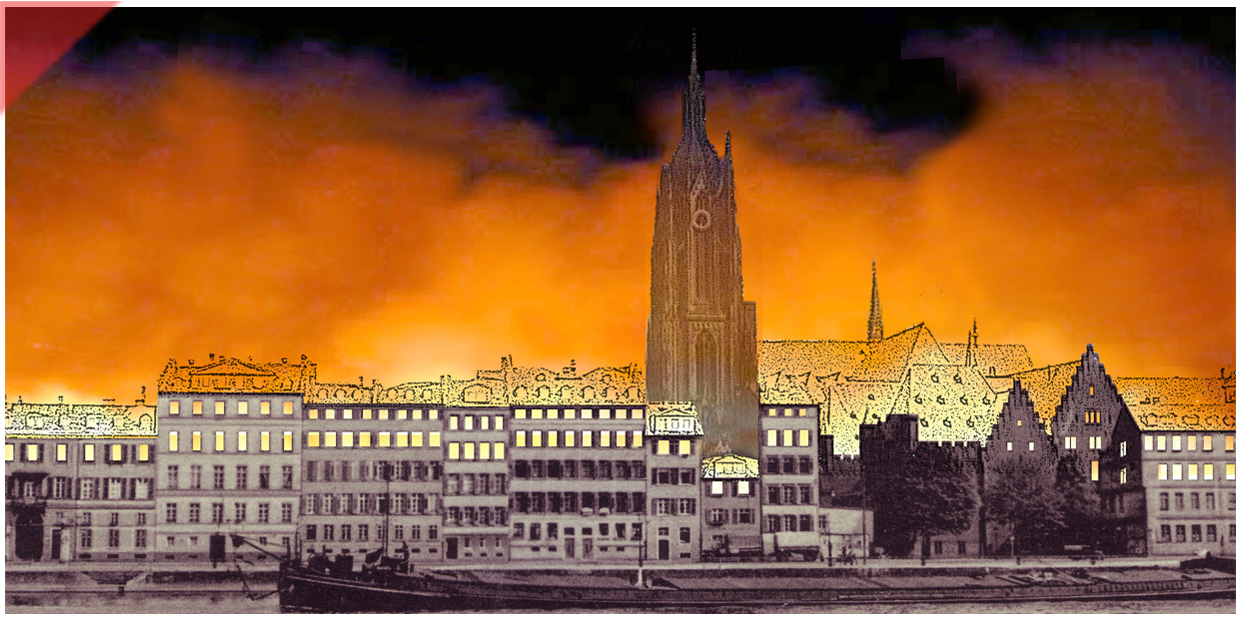 Die komplette westliche Hälfte der Frankfurter Altstadt brennt am Abend des 22. März 1944. Wir verwendeten eine farbige Ansichtskarte aus den 1930-er-Jahren. Das Feuer hat sich schon durch die oberen Stockwerke der Häuser hindurchgefressen (siehe die leeren Fensterhöhlen und die optisch aufgerissenen Dächer der Häuser). Der Turm des „Doms“ verschwindet leicht hinter dem Feuerschein. Im Main ist die Spiegelung des Feuers zu sehen.