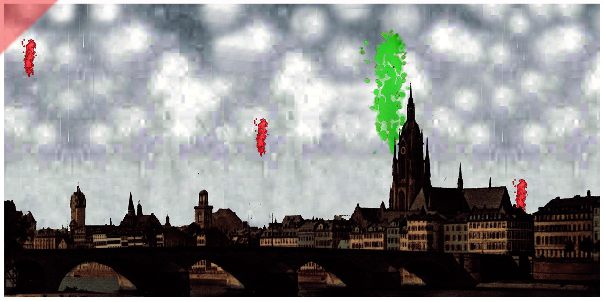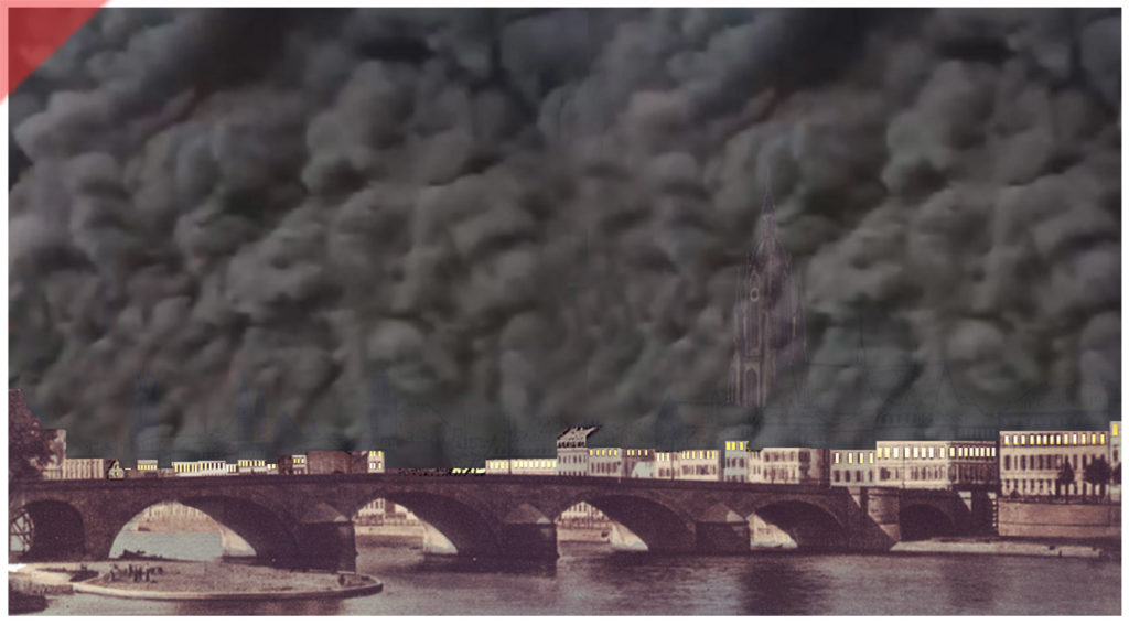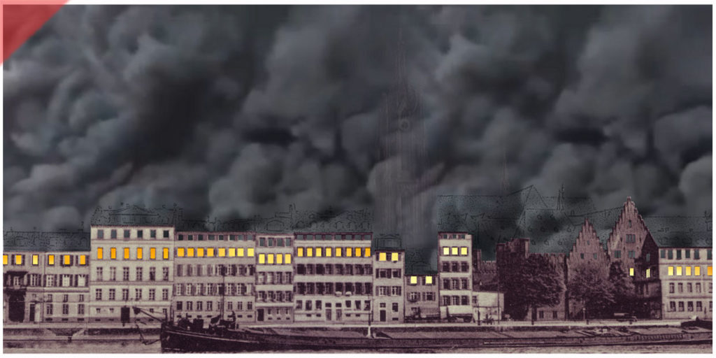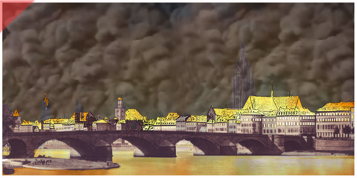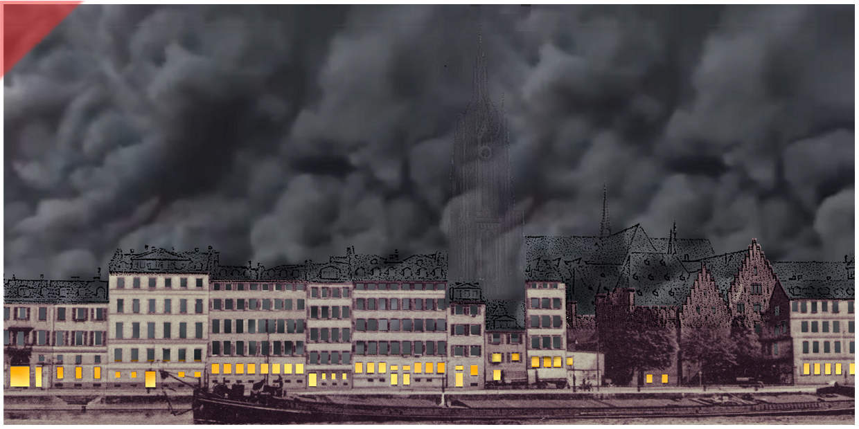 Zum Abschluss eine Visualisierung des Qualms ab Abend des 22. März 1944 – über der brennenden westlichen Altstadt von Frankfurt/Main. Der Turm des Doms ist leicht verdeckt zu sehen. Der Qualm wurde von Überlebenden des Stadtbrandes als stechend beschrieben – wie „geräucherter Aal“.
