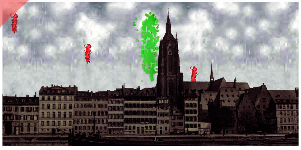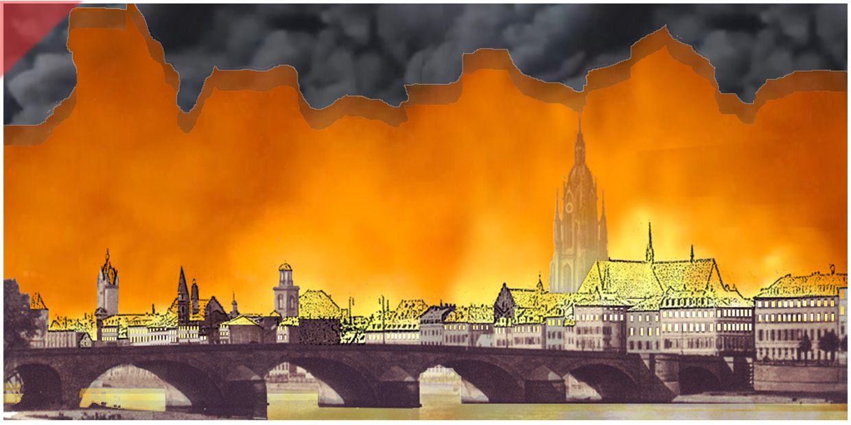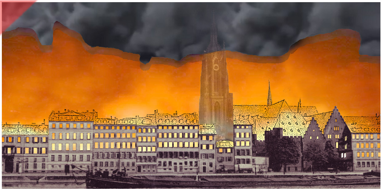 Die Frankfurter Altstadt brennt am Abend des 22. März 1944. Wir verwendeten als Basis eine alte Ansichtskarte. Der mittlere Bereich der Altstadt mit dem Dom im Zentrum steht in Flammen. Die Dächer der Häuser hätten nach der Aussage von Augenzeugen wie „Sauriergerippe“ ausgesehen. Diesen Effekt haben wir in das Motiv eingebaut. Das Feuer sitzt noch im oberen Bereich der Häuser (siehe die leeren Fensterhöhlen). Mit der Zeit fraß es sich bis in das Erdgeschoss der Häuser (siehe Motiv unten). Es wird auch davon berichtet, dass die Flammen des Stadtbrandes bis zur ersten Galerie des Kirchturms gereicht hätten. Dieser liegt optisch hinter einem leichten Feuerschein.