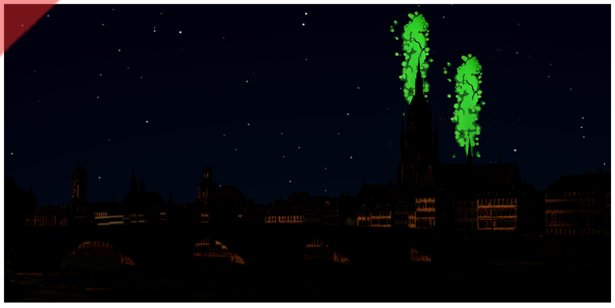 Der Turm des ´Doms´ bzw. der Kirche ´St. Bartholomäus´ war mit der Zeit hinter einer Qualm- und Rauchwand nur noch leicht zu erkennen; das belegen Zeugenaussagen von damals. Wie zeigen diesen Effekt. Hier die Variante mit den fast ausgebrannten Häusern – verbunden mit einer starken Rauch- und Rußentwicklung. Unser Vorschlag.