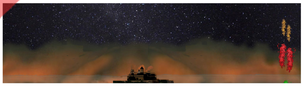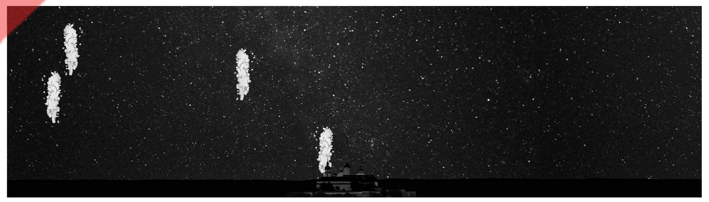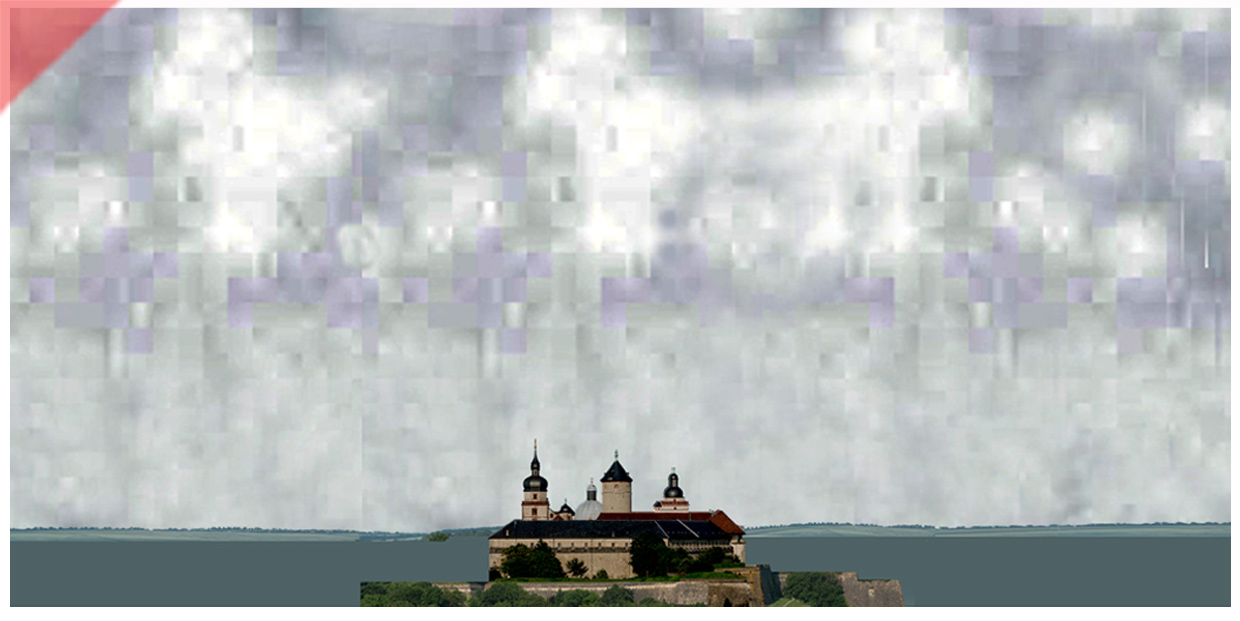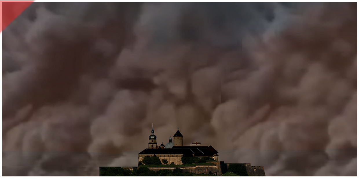 Detail-Blick auf die 3. Phase: Die Stadt brennt orangerot. Auch Teile der ´Festung Marienberg´. Die abgeworfenen Stabbrandbomben erzeugten einen Flächenbrand mit über 2.000 Grad Celsius. Bis zu 5.000 Menschen kamen ums Leben – verbrannt, erstickt oder verschüttet. Denn in Würzburg gab es für die Bevölkerung keine massiven oder öffentlichen Luftschutzbunker.