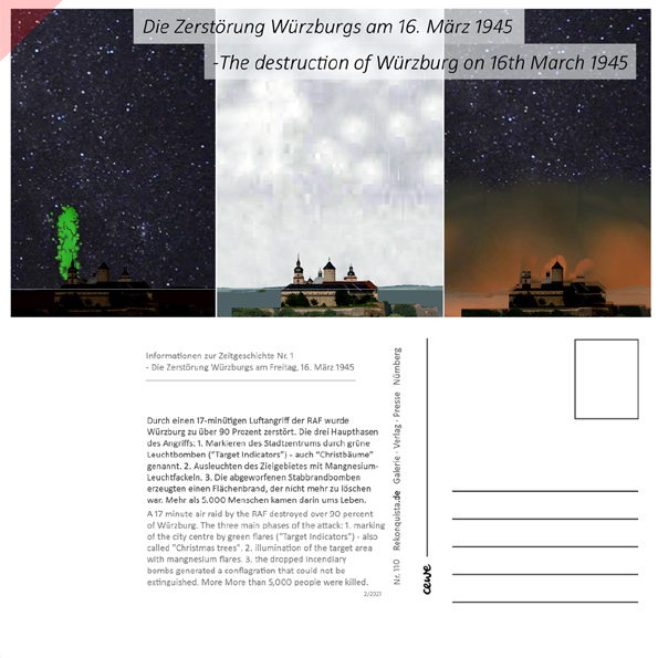 Zum Gestalten des 3-er-Motivs sichteten wir über Monate hinweg verschiedene Quellen (das Heft „Würzburg, 16. März 1945 21.25 Uhr – 21.42 Uhr“ von Heinrich Dunkhase, englische Bücher zu den Themen “Bomber Command” und „Pathfinder Force“, verschiedene Google-Quellen etc.).