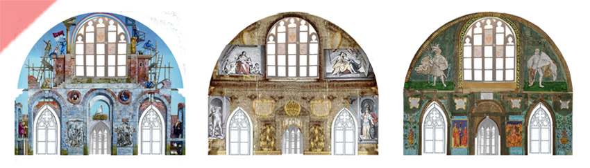 3. Prechtl wäre von den Entwürfen für alle Wandseiten gesichert. Es fehlt aber die Bemalung für die Fensternischen. Und über manche der dargestellten Personen kann man streiten.