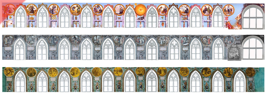 Die Entwürfe von Prechtl sind komplett erhalten. Bei Haggenmiller verwendeten wir die erhaltenen Dia-Farbaufnahmen aus dem Jahre 1944. Das Fehlende ergänzten wir über erhaltene Schwarz-Weiß-Aufnahmen.
