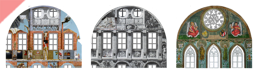 Links die Version von Prechtl, in der Mitte der Zustand bis 1945 (mit vier eingebauten Farb-Dias von 1944) und rechts die recherchierte Dürer-Version.