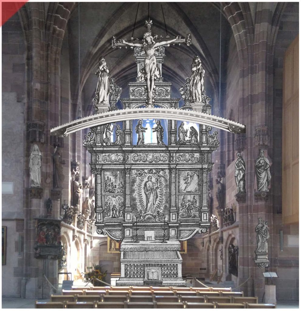 Der aktuell im Ostchor stehende ´Tucher-Altar´ ist nicht der frühere (Renaissance-)Hauptaltar der ´Frauenkirche´. Zwischen 1520-22, kurz vor der Reformation in Nürnberg, wurde der ´Welser-Altar´ im Ostchor aufgestellt. Er atmet optisch schon den Geist der Renaissance – einer neuen Zeit. Nach 1806 wurde er zerlegt und damit zerstört. Nur Teile davon haben sich erhalten. Wir bringen ihn zurück in die Gegenwart.