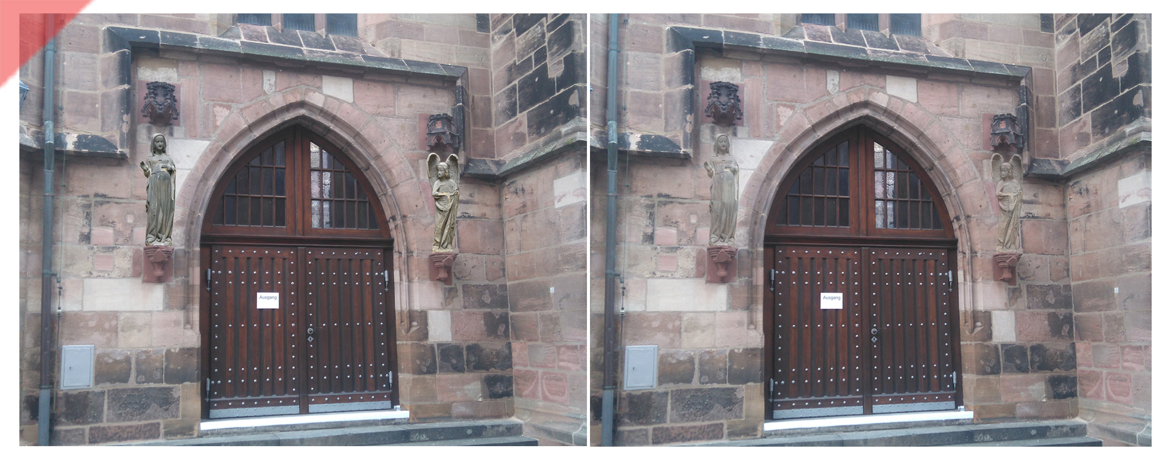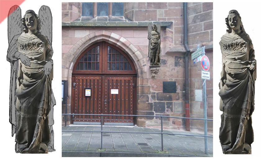 Der „Erzengel Gabriel“ oder der „Verkündigungsengel“ am Nordportal der Frauenkirche. Links die rekonstruierte Figur – rechts das ramponierte Original aus dem Bestand des ´GNM´. Wir geben dem Engel seine Flügel und Hände zurück.