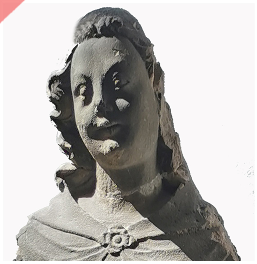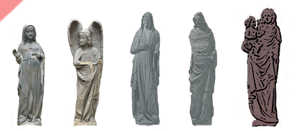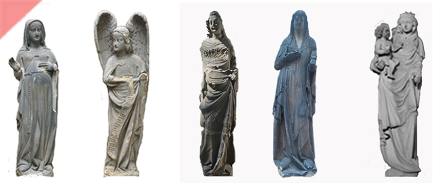 Zuerst der Blick auf das Südportal. Auf der linken Seite eine ´Maria´-Skulptur (mit leicht schwangerem Bauch). Rechts ein „Verkündigungsengel“. Uns liegen alte Fotografien vor, die die Figuren auf ihren früheren Plätzen zeigen – und ein Gefühl für die richtige Größe der Figuren geben.