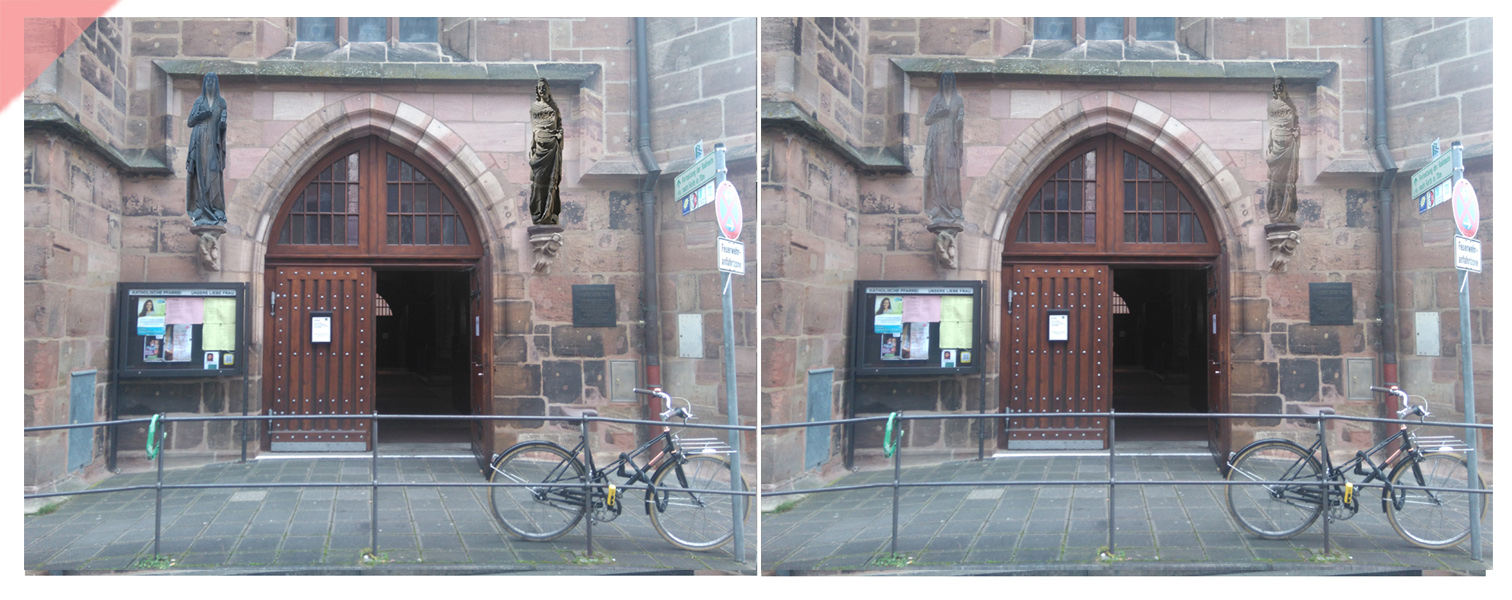 Auch hier können wir über erhaltene alte Fotografien den richtigen Platz und die Höhen der Skulpturen bestimmen. Rechts sind die Skulpturen wieder aufgehellt zu sehen. Die jetzige Lücke wird dadurch ersichtlich.