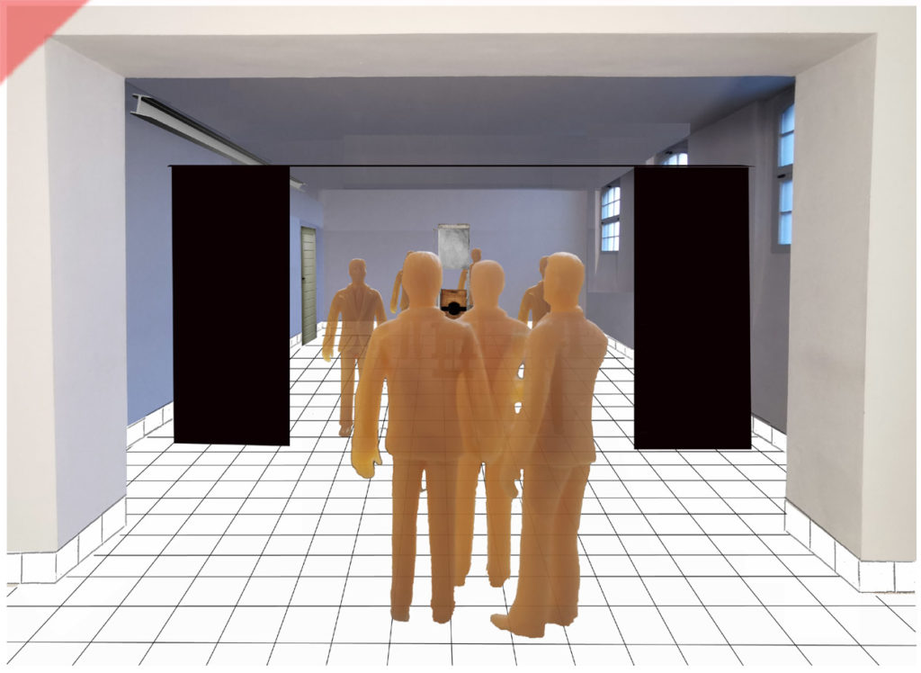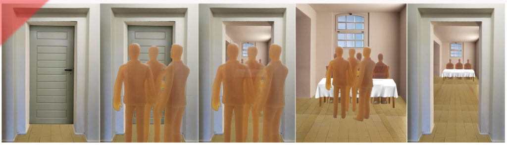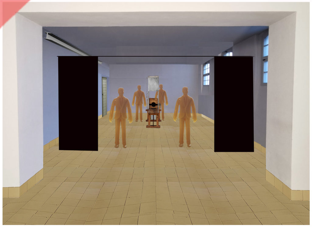 In einer Art Zeitleiste zeigen wir die Schritte bis zur Hinrichtung. Links die geschlossenen Tür zum HInrichtungsraum, dann der Verurteilte mit den beiden Wärtern, die Türe öffnet sich, darauf folgte der Namensabgleich am Tisch mit den drei Vollstreckungsbeamten. Diese sind am Ende allein zu sehen (der Gefängnisleiter, der die Hinrichtung leitende Staatsanwalt und der Gefängnisarzt). Plus evtl. eine weitere Person (zum Öffnen der Türe, Vorbereiten der Unterlagen, Anfordern/Holen des nächsten Verurteilten).