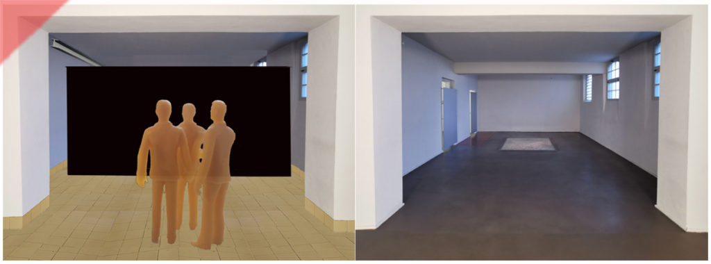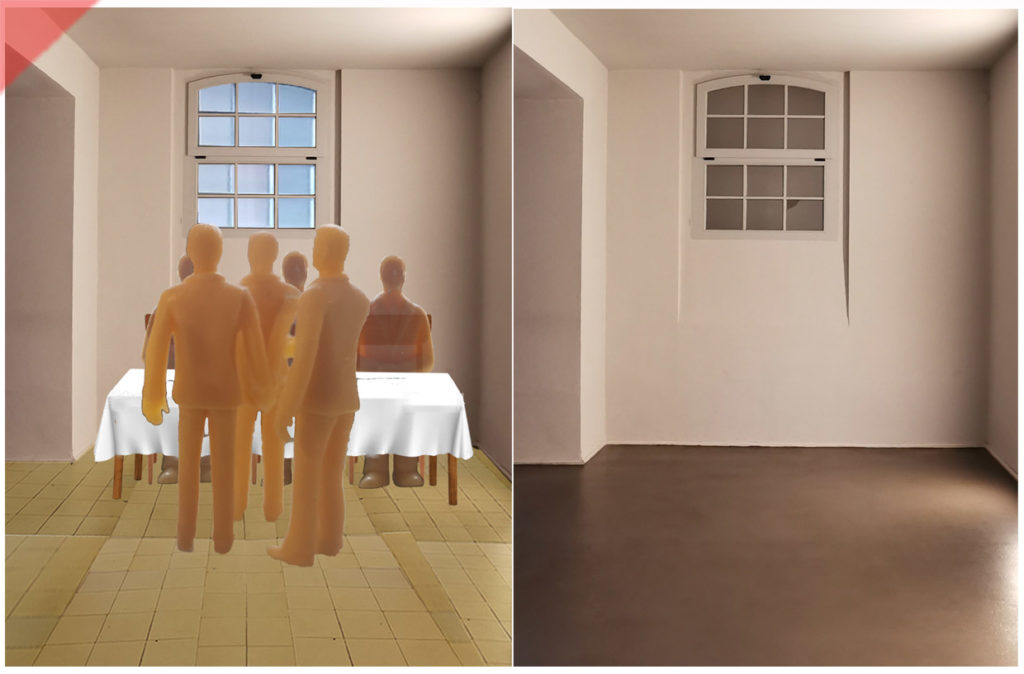 Der Verurteilte steht am Tisch mit den drei Vollstreckungsbeamten. Dort erfolgte der Namensabgleich und die nochmalige Verkündung/Verlesung des Todesurteils. Rechts die aktuelle Optik zum Vergleich. Das jetzt abgedunkelte Fenster änderten wir in unserem Damals-Entwurf ab. Die gelben Fliesen sind keine pauschale Erfindung, sondern an anderer Stelle im Gefängnis Halle zu sehen. Nach Quellenlage ab 1900 verbaut.