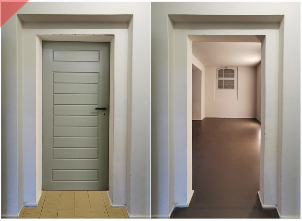 Links unser Vorschlag für den damaligen Hauptzugang in den Hinrichtungsraum. Rechts die aktuelle Optik. Die verwendete Holztüre ist in der Nahe des früheren Hinrichtungsraums noch original lackiert vorhanden. Sie wirkt solide gebaut – und stammt deshalb wohl nicht aus der DDR-Nachkriegszeit. Sondern ist älter.