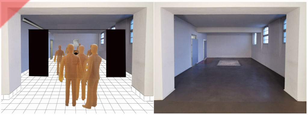 Ein erster Damals-Jetzt-Vergleich des Hinrichtungsraums – bei geöffnetem Vorhang. Der massive Deckenunterzug in der Mitte des Raumes ist eine statische Ergänzung nach 1945, als in der DDR-Zeit das bestehende Gebäude aufgestockt wurde. in unseren Motiven entfernten wir ihn deshalb (bau-)historisch richtig.