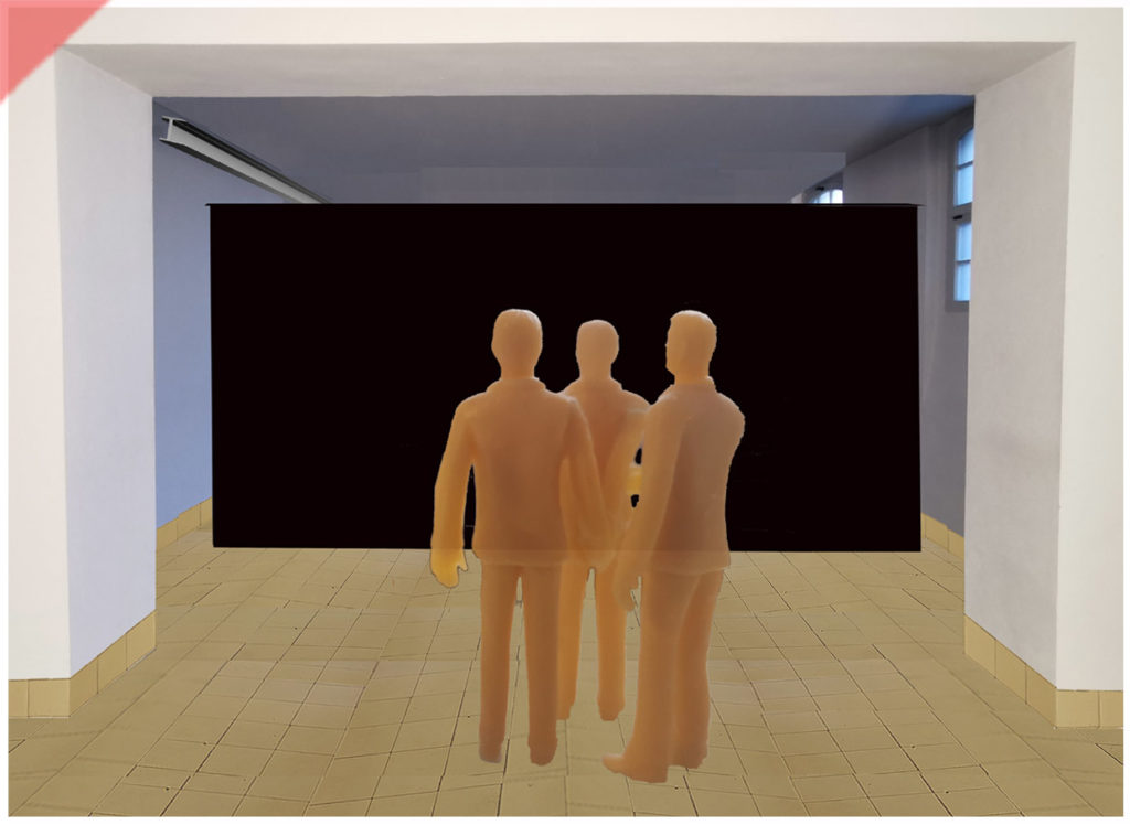 Zum Abschluss der Blick in den Vorraum. Am Tisch sitzen der Gefängnisleiter, der Anstaltsarzt und der leitende Staatsanwalt. Eventuell gab es noch eine vierte assistierende Person (zum Öffnen der Türe und zum Holen bzw. Aufrufen des nächsten Verurteilten). In Stadelheim gab es diese vierte Person sicher. Für Halle schlagen wir es daher ebenfalls vor.