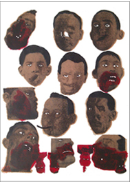 Eine Siebdruck-Arbeit in der Größe 83 x 59 cm; DIN A2. Mit ihren brutalen Gesichtsverletzungen werden 12 deutsche Soldaten aus dem berühmten Buch „Krieg dem Kriege“ von Ernst Friedrich erstmals in Farbe gezeigt.