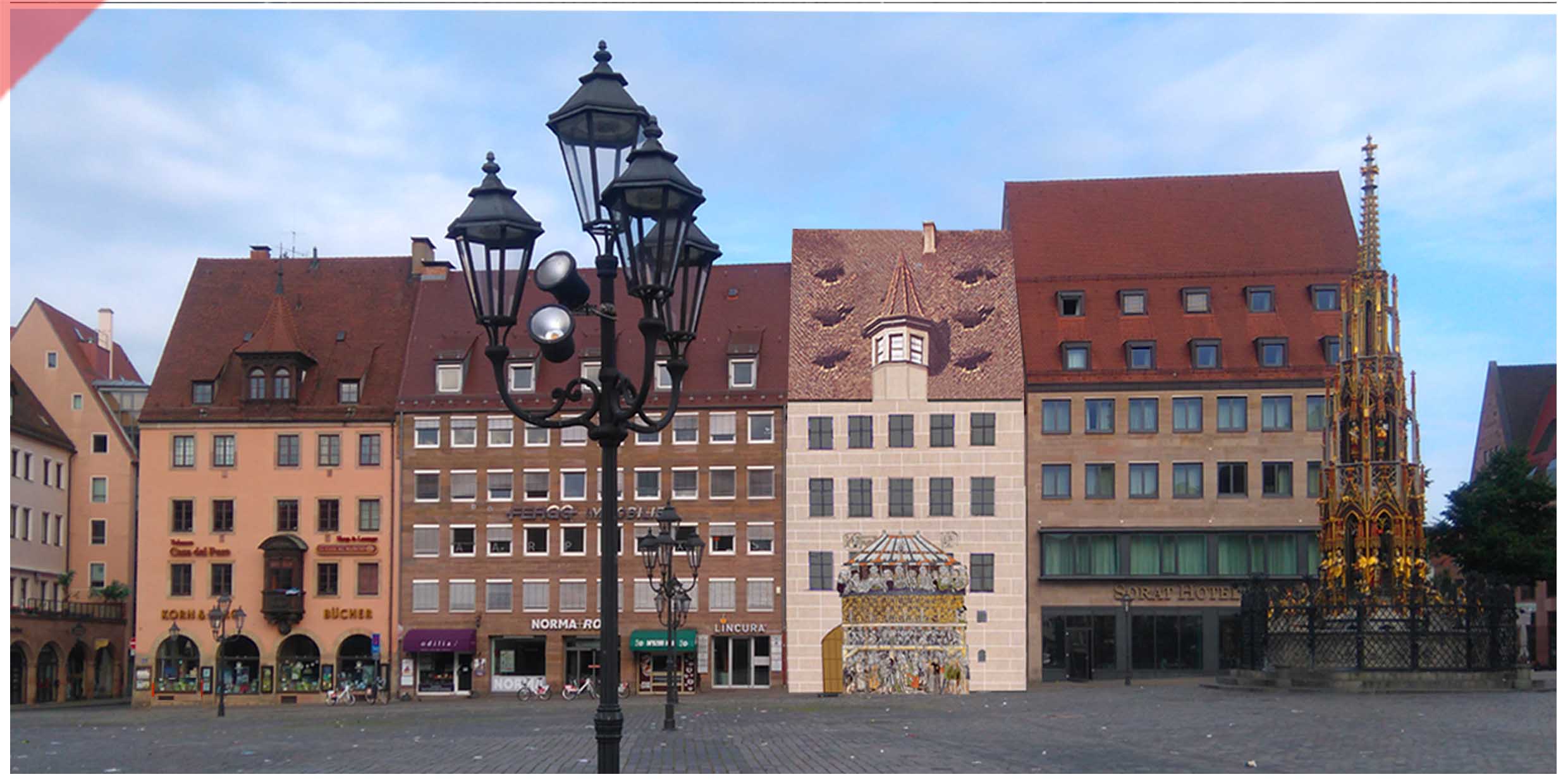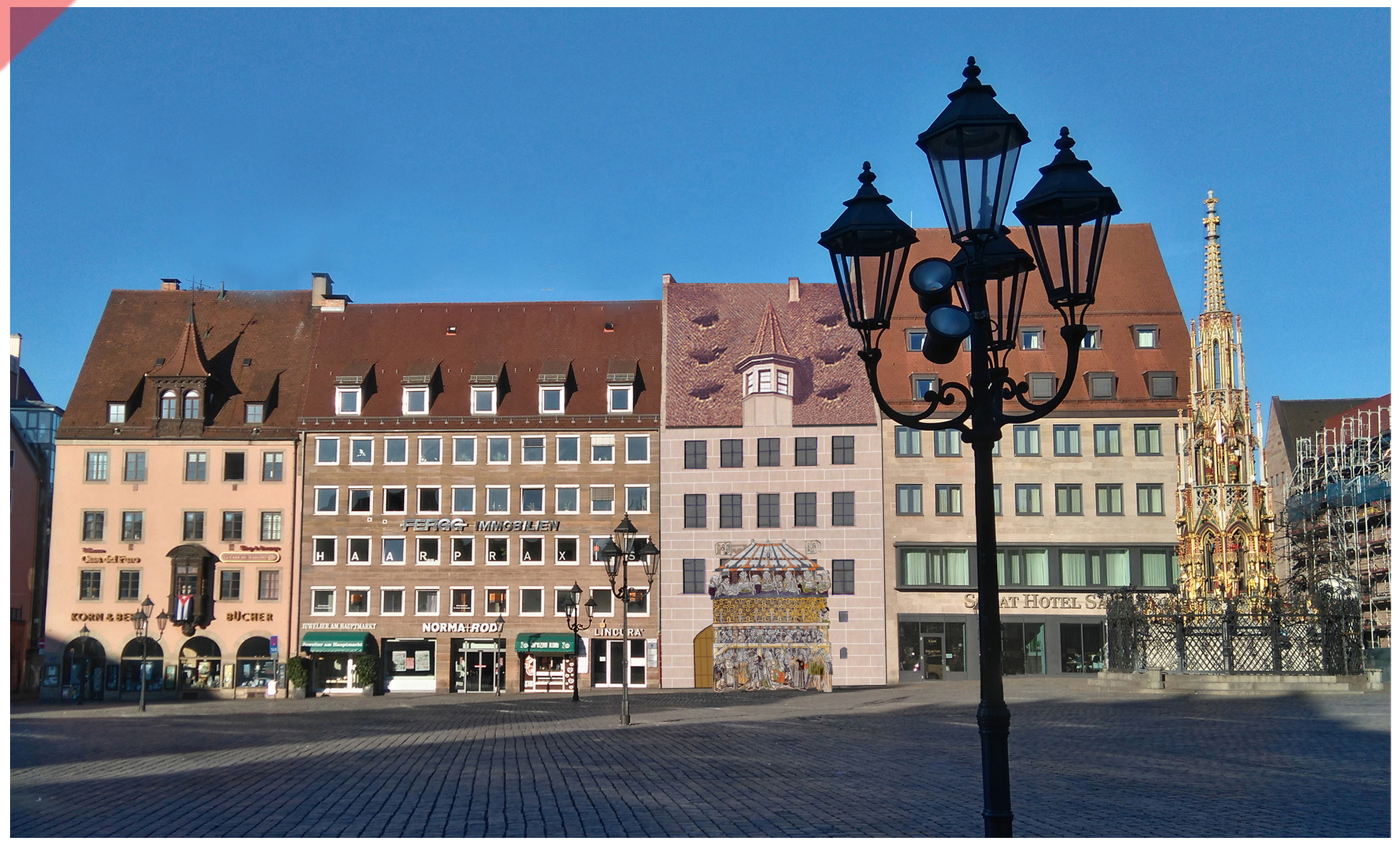 Wir zeigen das Gebäude ´Hauptmarkt 15´ aus einem leicht anderen Blickwinkel aus Osten. Die große gusseiserne Laterne fällt optisch nicht mehr so dominant in den Blick. Und wir zeigen die komplette westliche Häuserzeile des Nürnberger ´Hauptmarktes´ in der recherchierten damaligen Optik. Ein Interessanter Damals-Jetzt-Vergleich.