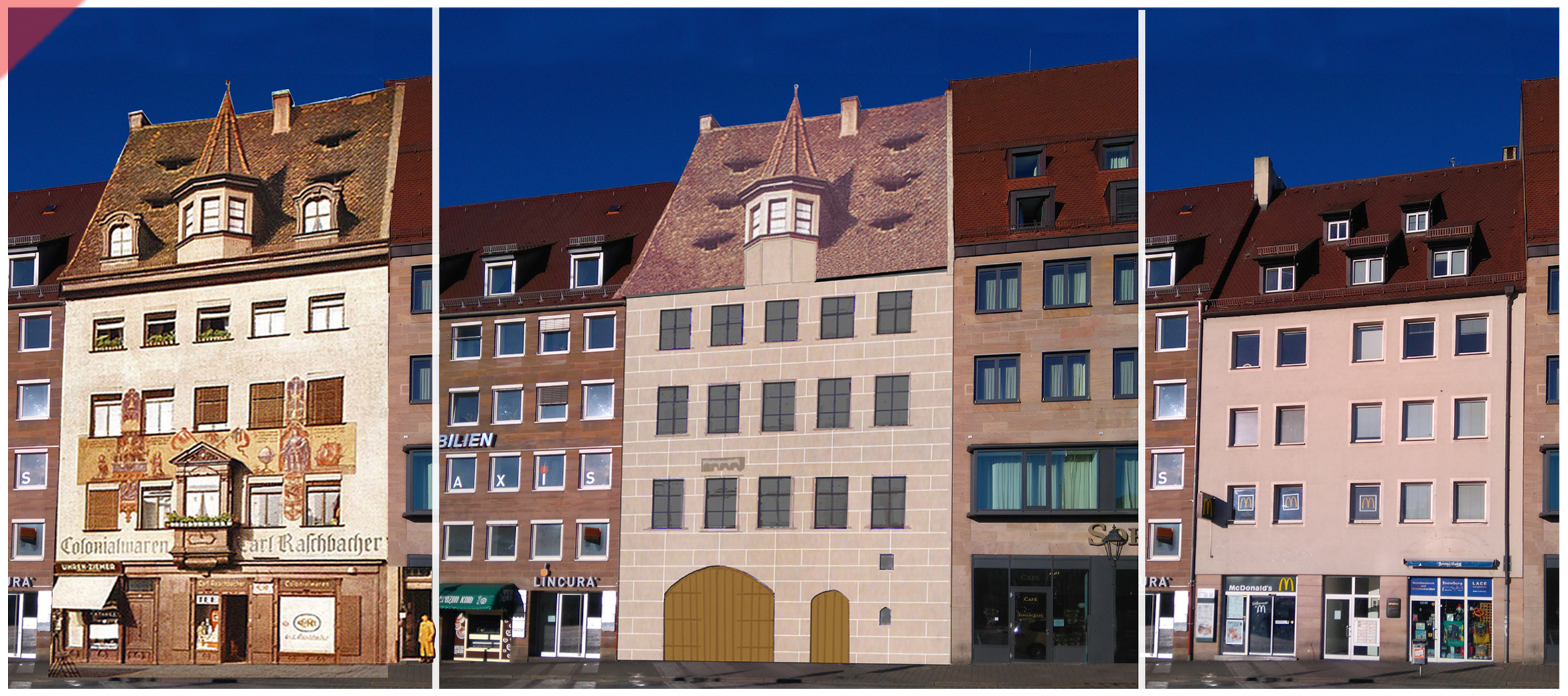 Links die Fassade vor der Zerstörung am 2. Januar 1945, in der Mitte die rekonstruierte Fassade bis 1523 (mit dem Schmuckstein) und rechts die aktuelle Optik.