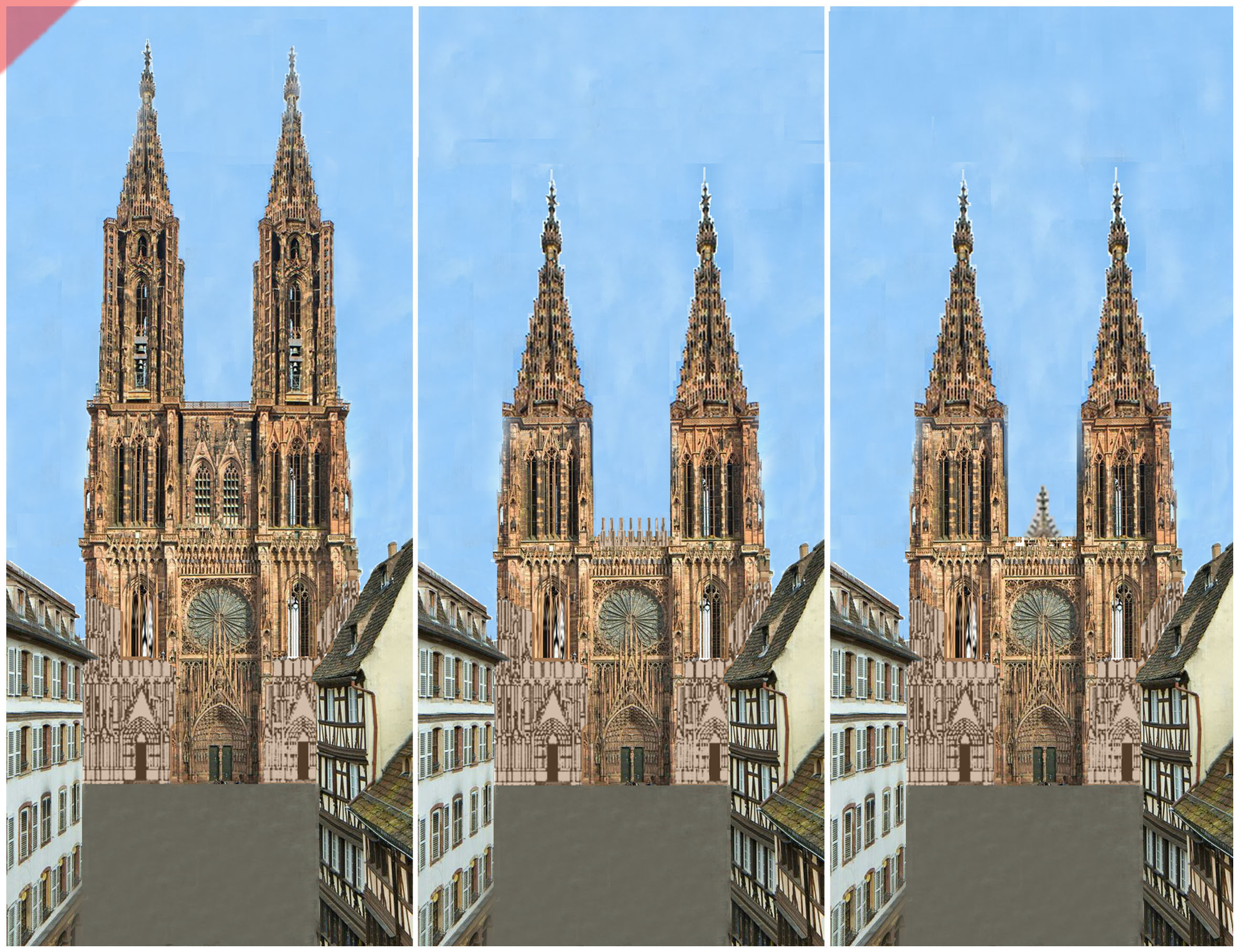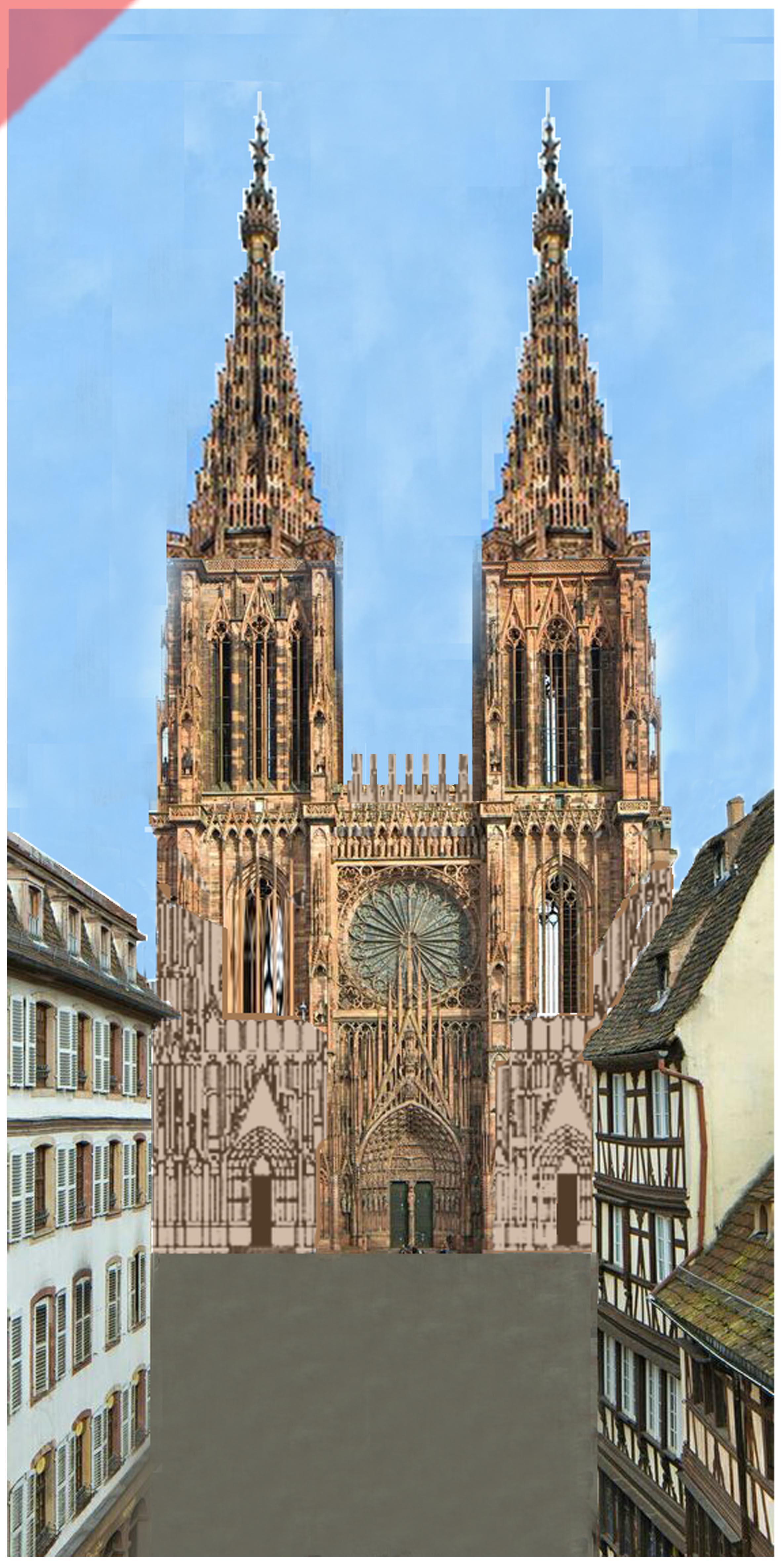 Auch zur Kathedrale (bzw. dem vormaligen deutschen Münster) von Straßburg können wir neue Motive anbieten: Neben einer Simulation der kompletten Westfassade (mit zwei Türmen) neuartige Visualisierungen für eine niedrigere Westfassade. Wir erweiterten optisch den Blick auf die Westfassade – und entfernten hierfür auf den Fotos links und rechts Gebäude. Und bauten Teile des originalen Fassadenplans aus dem 13. Jahrhundert ein.