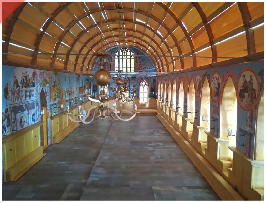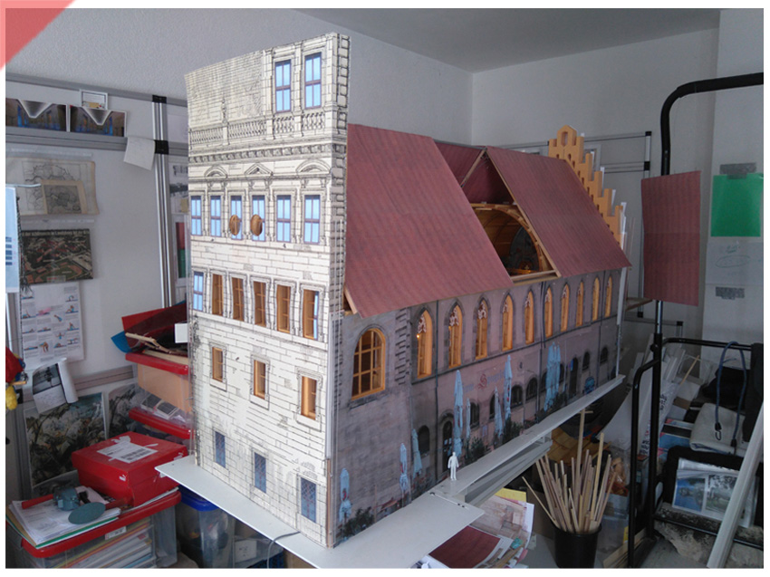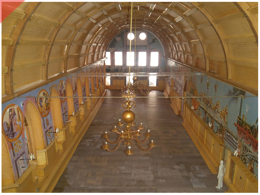 Das Dürer-Modell des Saals lässt sich von den Wänden und dem Dachstuhl her umbauen. Dadurch bietet sich die Möglichkeit, auch die aktuelle Optik des Nürnberger Rathaussaals zu zeigen.