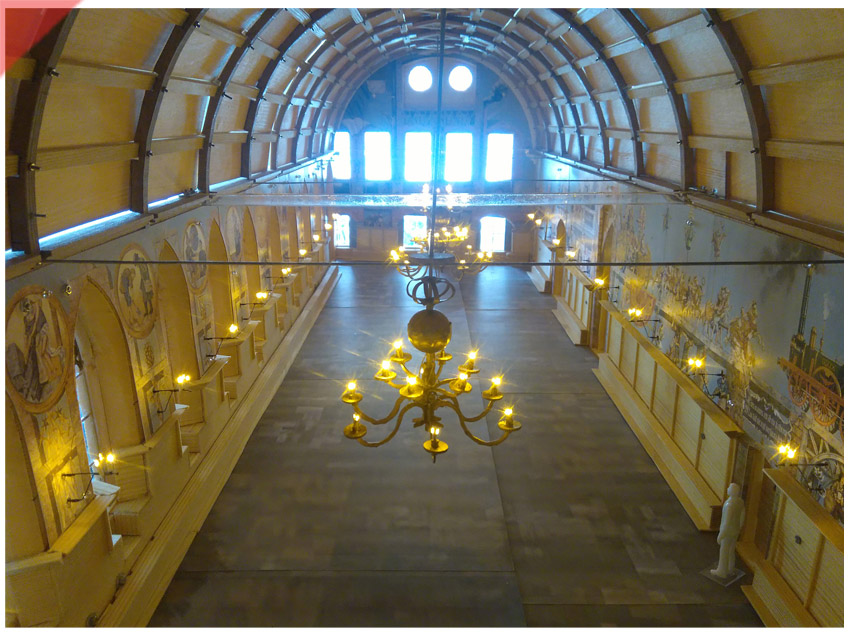 Der entgegen gesetzte Blick in den Saal – von West nach Osten. Bei Tageslicht. Der Blauton der Wände harmoniert wieder gut mit dem Naturton des Holzes. Unten rechts eine weiße Figur als Größen- bzw. Vergleichsmaßstab.