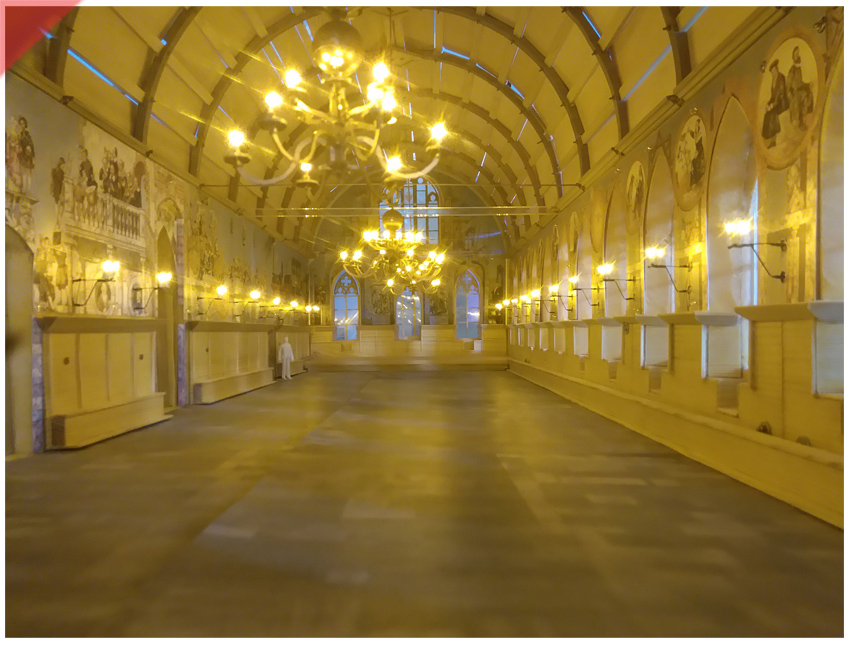 Der Blick in den beleuchteten Saal – von West nach Osten. Die realen Lampen im Saal strahlen auch ein gelbliches Licht aus.