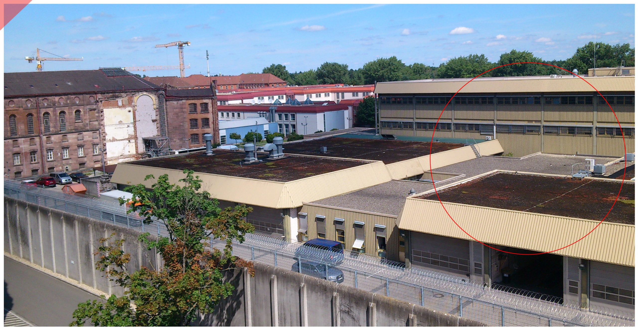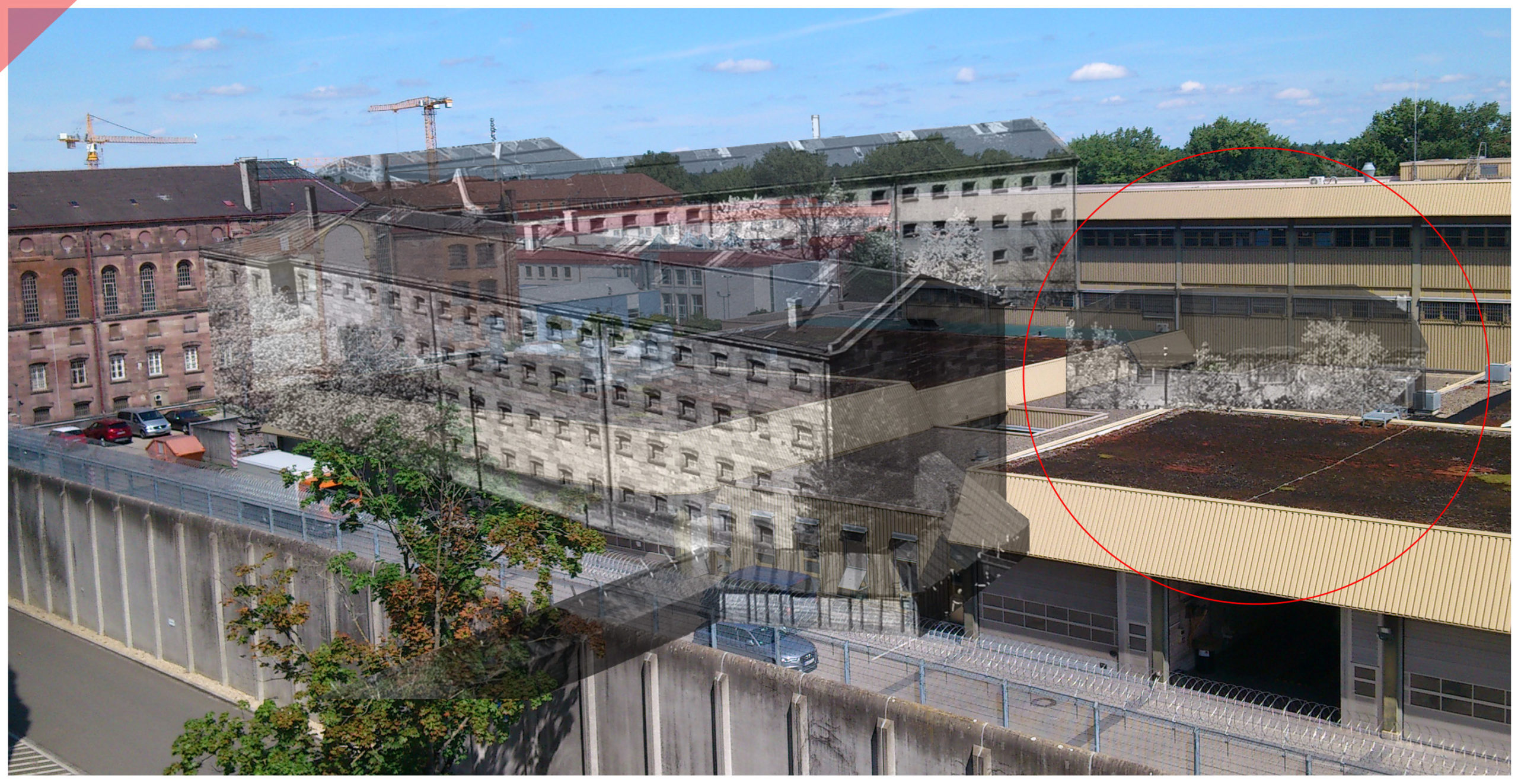 Blick aus dem 3. Stock: Links ein erhaltener Gefängnistrakt. Rechts die ab den 1980-er-Jahren neu errichteten und optisch hässlichen Gefängnisneubauten. Der rote Kreis markiert den früheren Standort der Gefängnisturnhalle (siehe Bild darunter). In dieser wurden am 16. Oktober 1946 die zehn Todesurteile durch Erhängen vollstreckt.