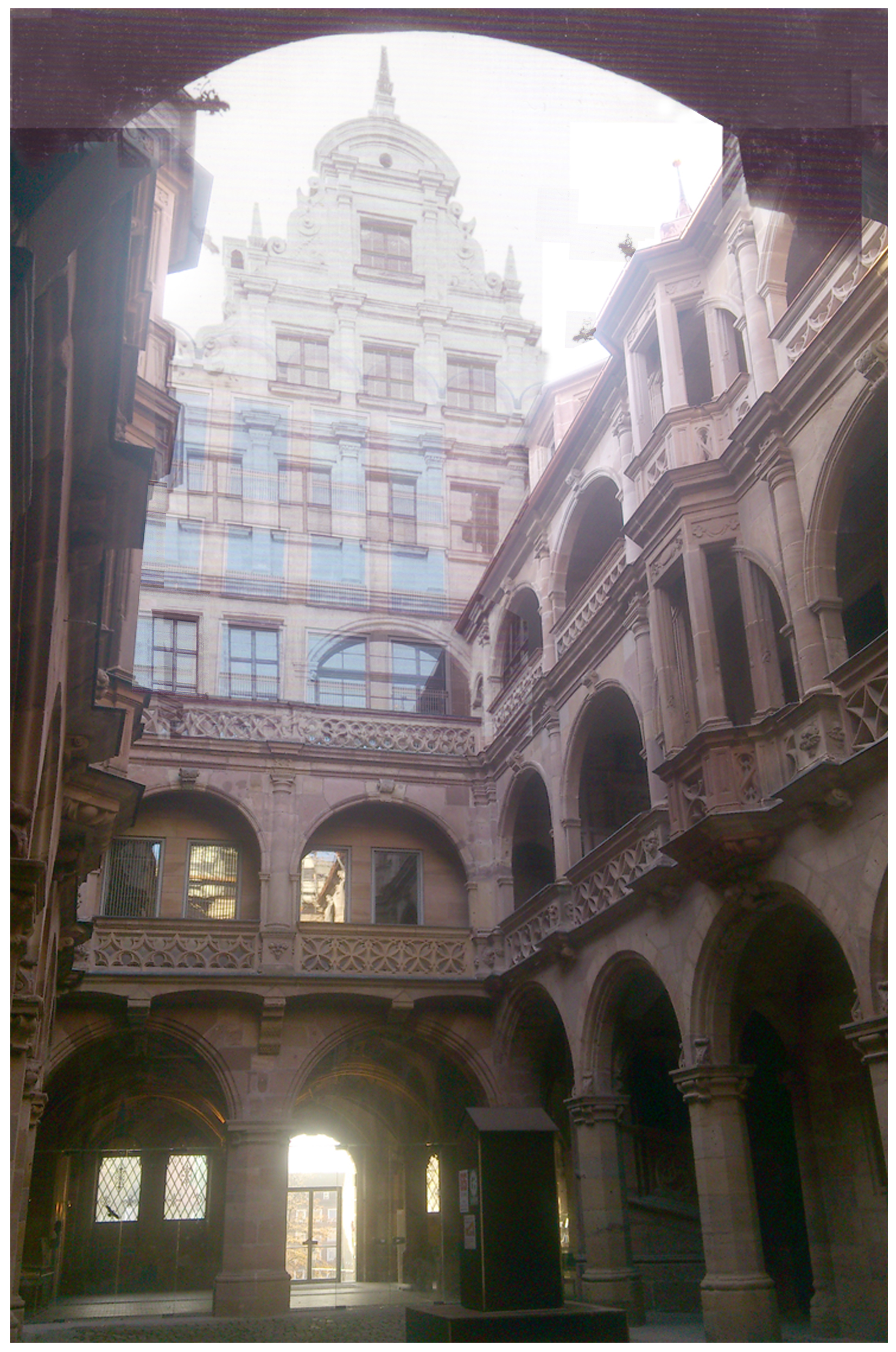 An der Südseite des Innenhofes Hofes lacht noch die Fratze des hässlichen Pellerhaus-Nachfolgebaus aus dem Jahre 1957 dem fast wiederhergestellen Hof entgegen.
