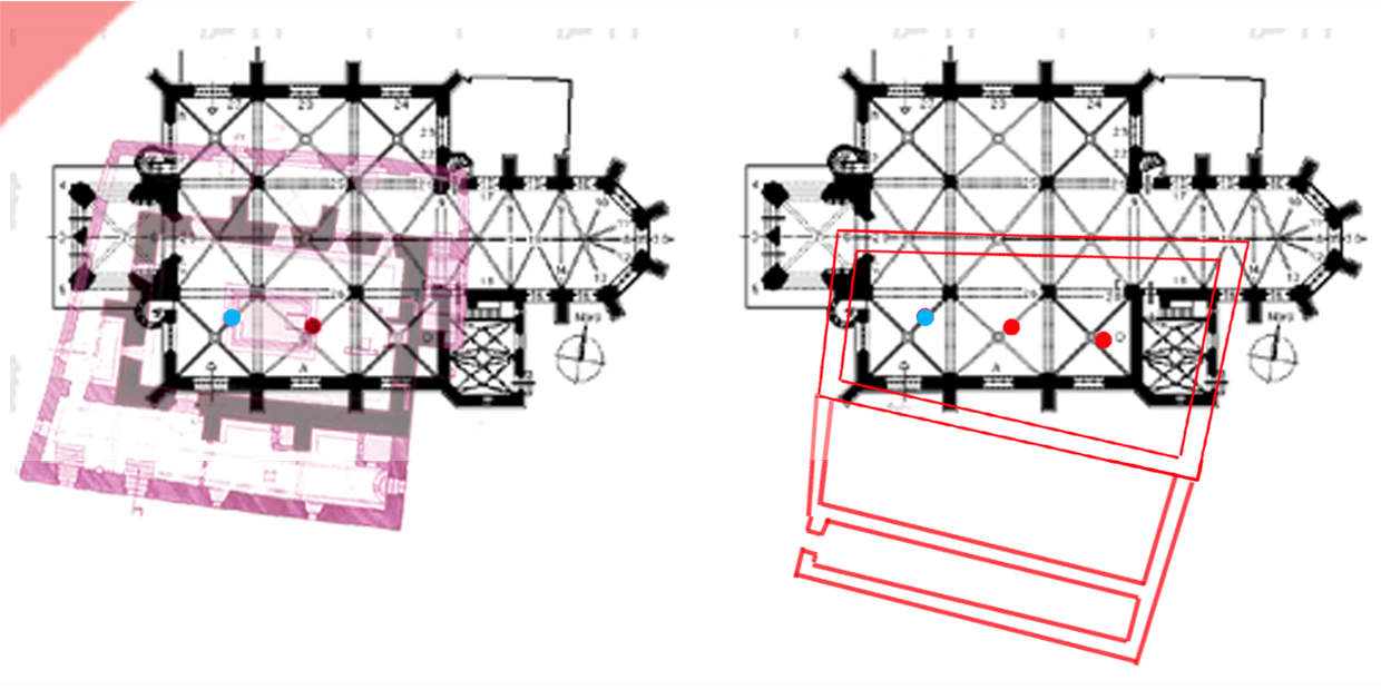 Für unsere Rekonstruktionen bzw. Vorschläge zum Aussehen der früheren Nürnberger Synagoge am ´Hauptmarkt´ haben wir umfangreich recherchiert. Hier ein Muster-Beispiel: die Grundrisse der Nürnberger ´Frauenkirche´, der der erhaltenen Alt-Neu-Synagoge in Prag (links) und der der 1519 abgerissenen Synagoge in Regensburg (rechts). Der blaue Punkt zeigt jeweils das in Nürnberg 1986 gefundene und im Boden erhaltene Säulen-Fundament. Unser Fazit: Die Breite bei beiden Synagogen ist ähnlich, in Regensburg gab es im Innern eine Säule mehr.