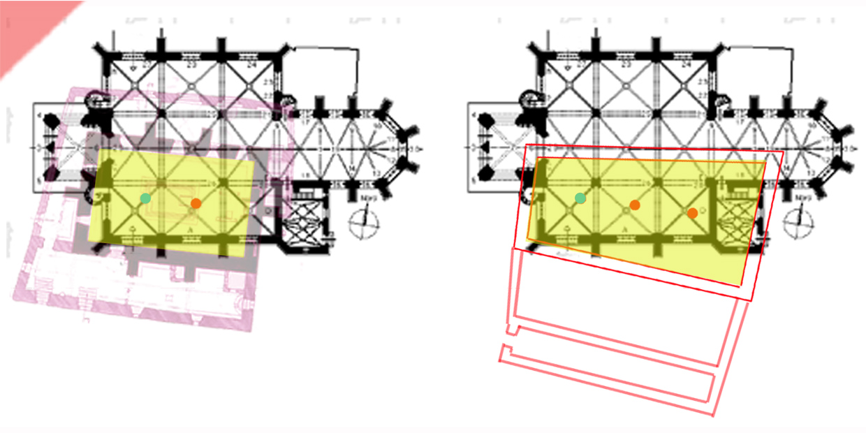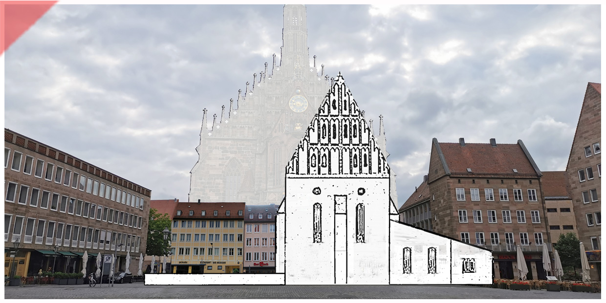Als Einstieg zeigen wir die frühere mögliche Umrisslinie der Synagoge zusammen mit dem möglichen Innenraum – auf der Basis einer Darstellung der Regensburger Synagoge von 1519. Ein Gefühl für die Dimension und Größe des Gebäudes wird so möglich. Der frühere Boden des Innenraums lag in Nürnberg (wie bei jeder mittelalterlichen Synagoge) unter dem des Außenbereichs.