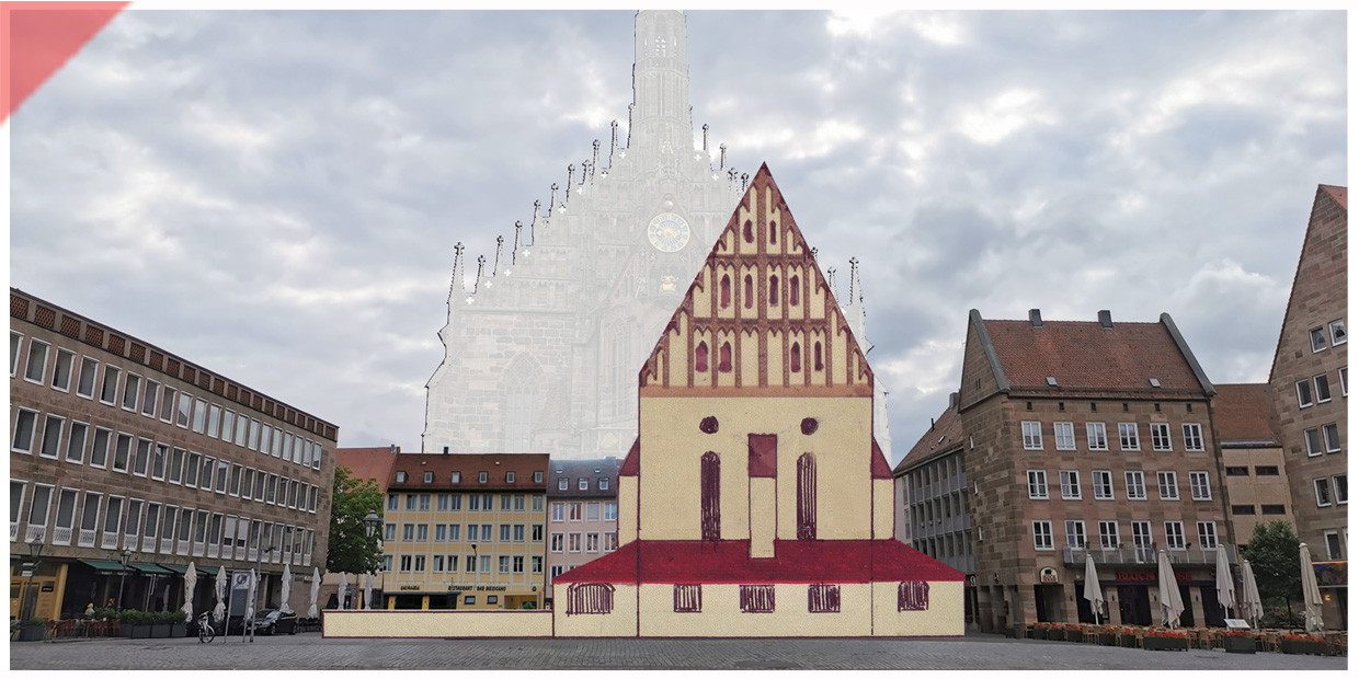 Das gleiche Motiv: jetzt mir roter Backsteinoptik und ockerfarbenem Putz. Angelehnt an die erhaltene Prager Alt-Neu-Synagoge. Diese Giebelform mit Fialen noch oben gab es im 14. Jahrhundert in Nürnberg. Die Frage bleibt offen, ob der damalige Rat der Stadt Nürnberg der jüdischen Gemeinde eine solche Schmuck-Optik beim Bau der Synagoge erlaubt hatte.