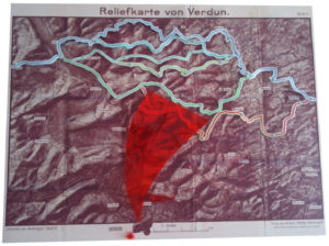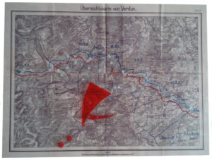 Frontkarte1: Eine Verdun-Frontkarte aus den 1920-er Jahren wurde von uns überarbeitet. Die Frontlinien der Tage 21.-25. Februar als über dem Gelände schwebende Linien in hellblau dargestellt. Der große rote Pfeil die fiktive deutsche Stoßrichtung ab dem 25. Februar – in Richtung der Zitadelle von Verdun und dem Tunnel von Tavannes als sichere Schutzunterstände. Auch hätte die einzige Zufahrts- und Nachschubstraße nach Verdun, die spätere „Voie Sacree“ konsequent beschossen werden müssen. Auch der Haupteingang zu den unterirdischen Räumen der „Zitadelle“ von Verdun. Dies geschah nie bis zum Ende der Schlacht.