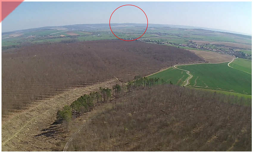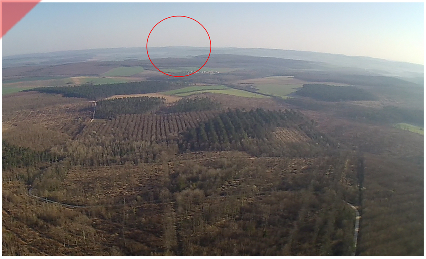 Der Drohnenblick aus rund 150 Metern Höhe von der Höhe „304“ in Richtung der Stadt Verdun bzw. dem Fort „Douaumont“. Im roten Kreis liegt die Hügelkuppe mit dem Fort „Douaumont“. Rund 15,8 km entfernt.