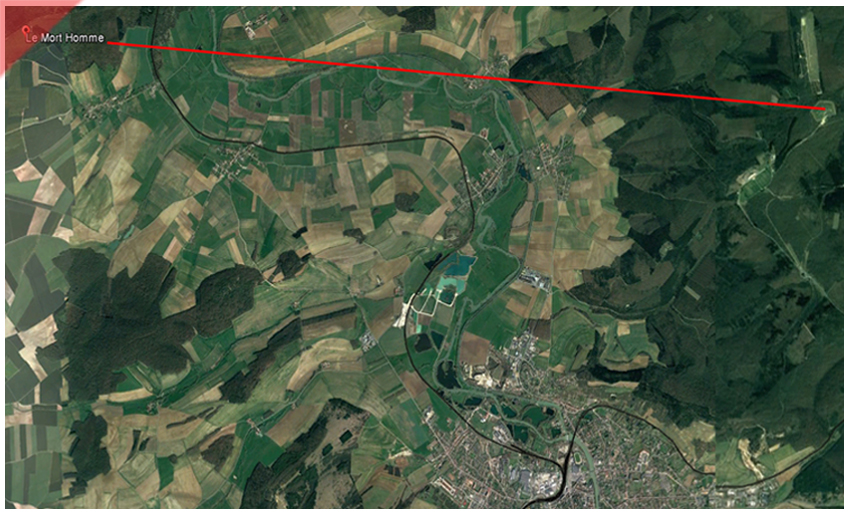 Eine Google Earth-Aufnahme visualisiert den Blickwinkel. Die rote Linie endet rechts auf Höhe des Forts „Douaumont“. Die Stadt Verdun ist unten rechts zu erkennen.